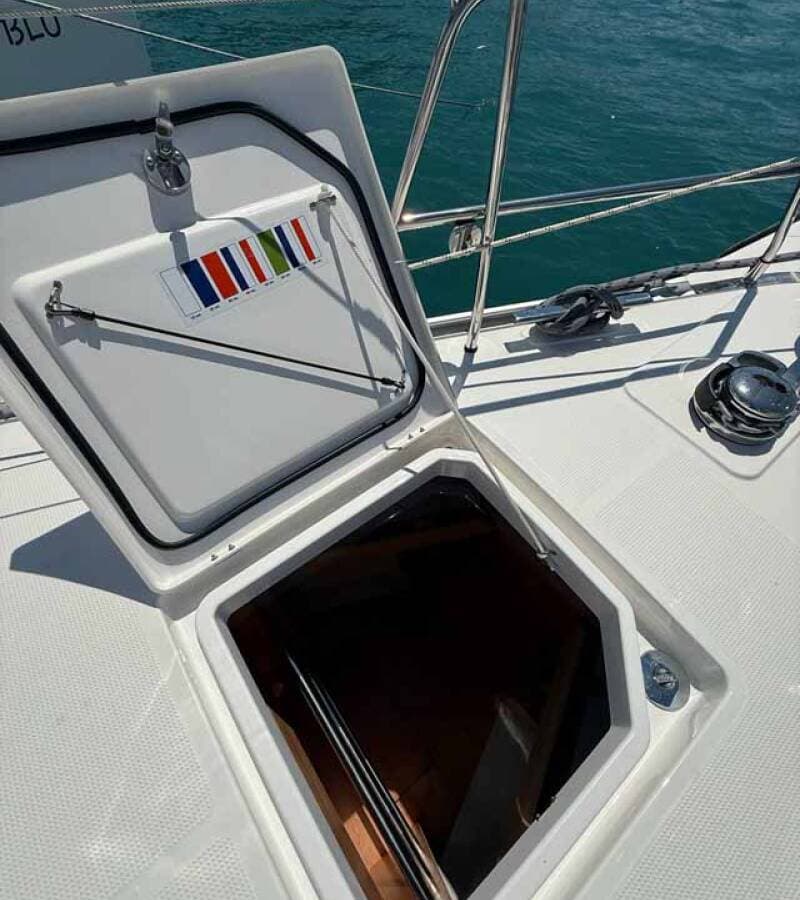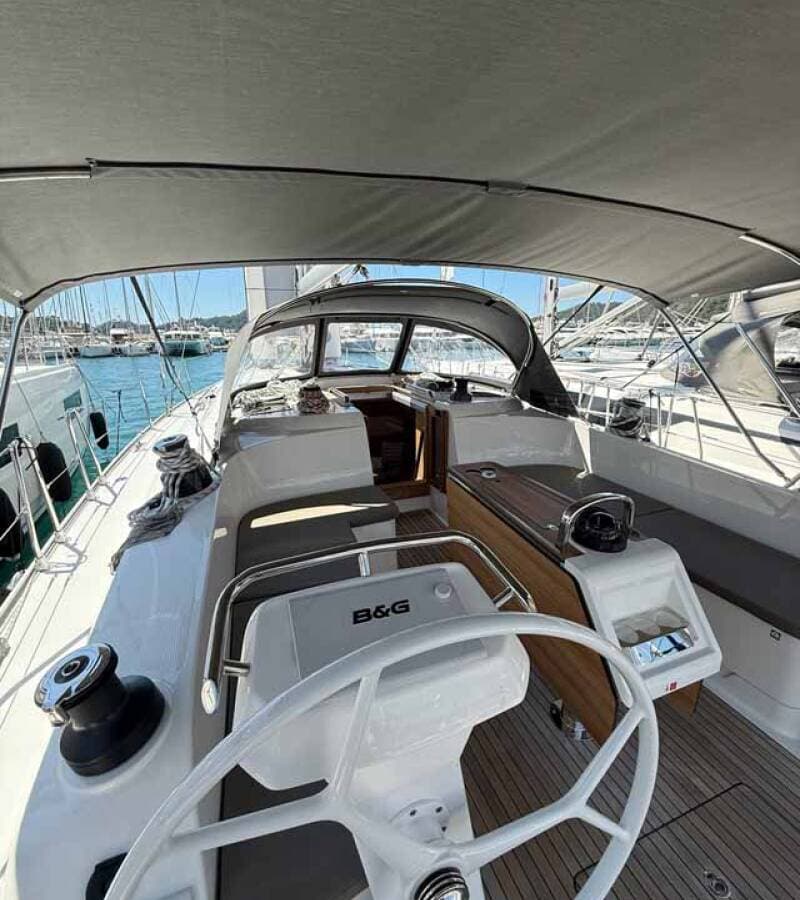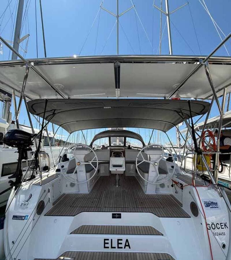 - DeckAnchor swivelBimini topBlack ballBlack conusBoat hookBosun's chair (Safe seat) (boatswain's chair)Cockpit tableCockpit/stern, outside showerDavitDinghyElectric anchor windlassFendersGangwayMain anchor Mooring ropes Spare anchor (Reserve, Auxiliary anchor)SprayhoodSpring lineTeak cockpitWater hose