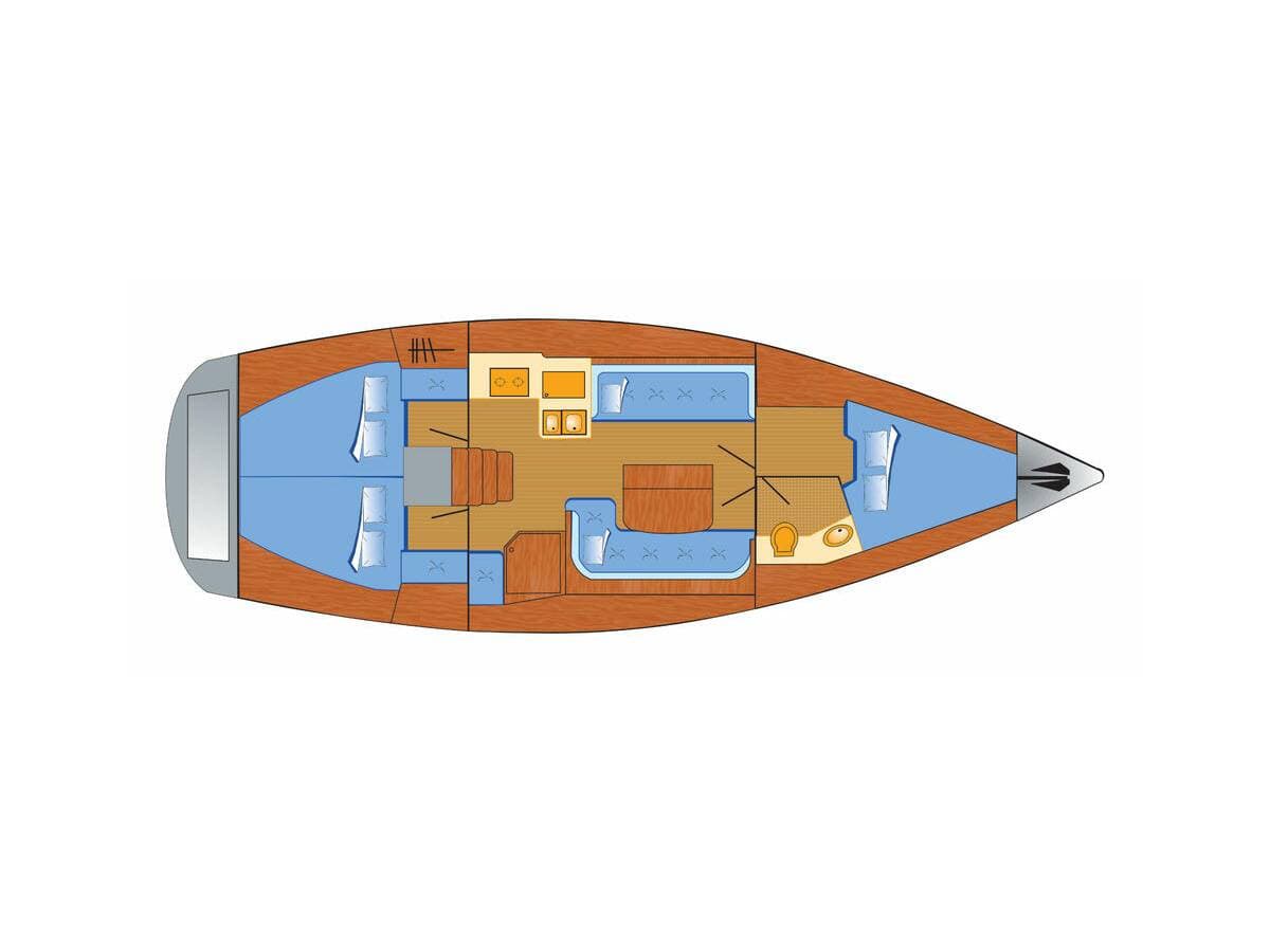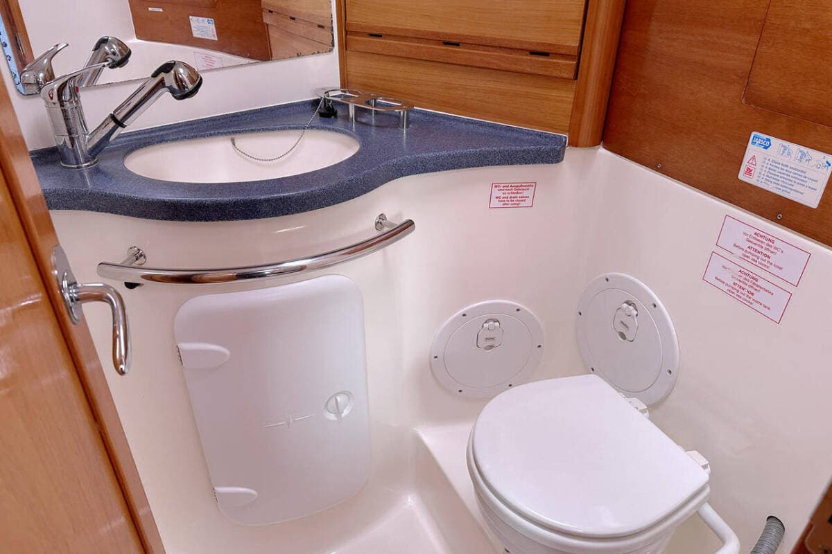 - DeckAnchorBilge pump - MechanicBlack ballBoat hookBosun's chair (Safe seat) (boatswain's chair)Cockpit tableCockpit/stern, outside showerDeck brushElectric anchor windlassFendersMooring ropes Spotlight / HeadlightsSprayhood
