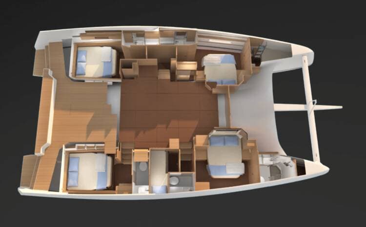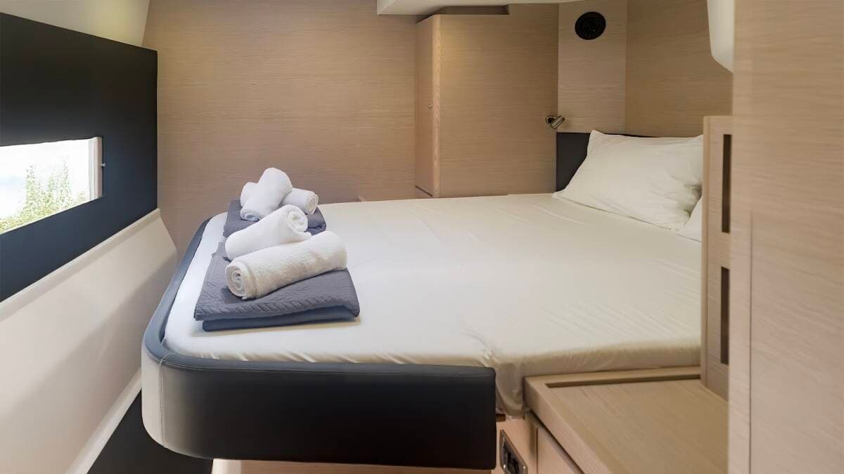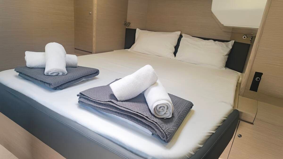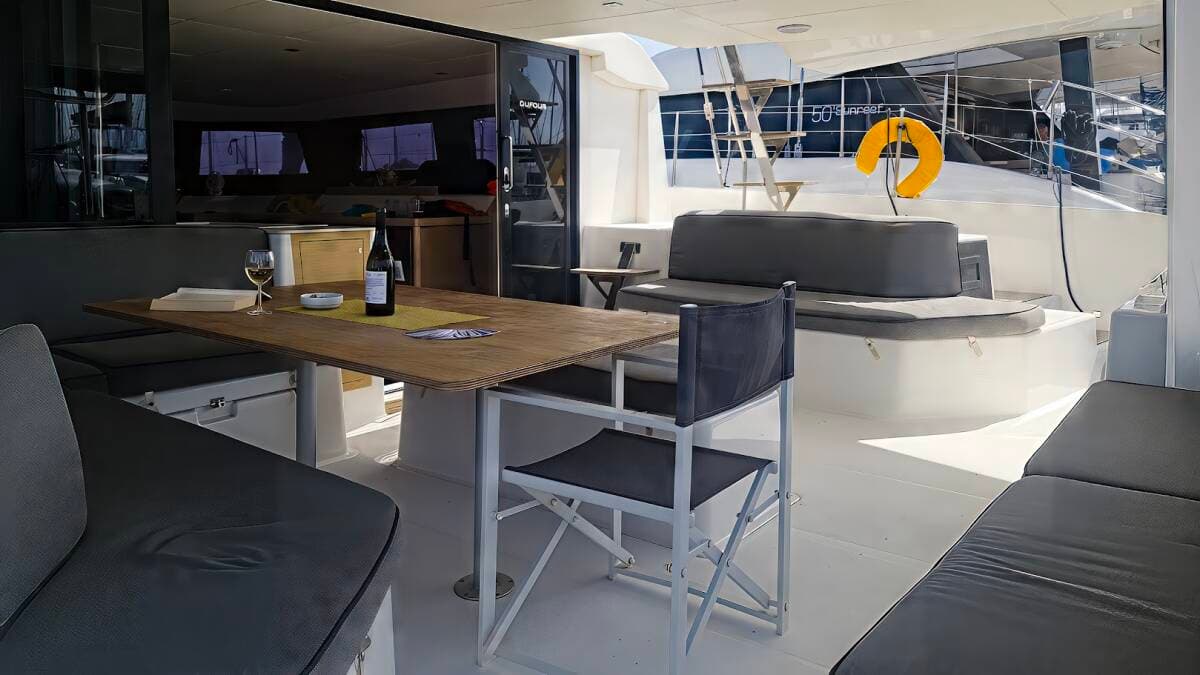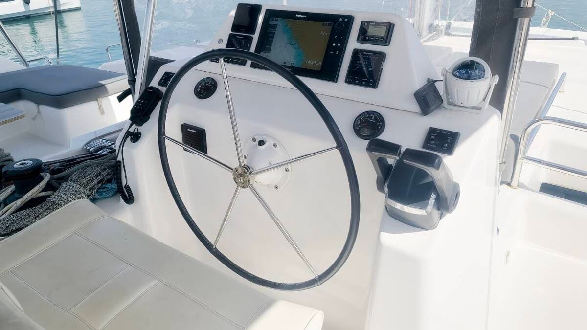 - DeckBimini topCockpit tableCockpit/stern, outside showerDavitDinghyGrill/Barbecue/PlanchaHydraulic gangwayOutboard engineSprayhoodSwimming ladder