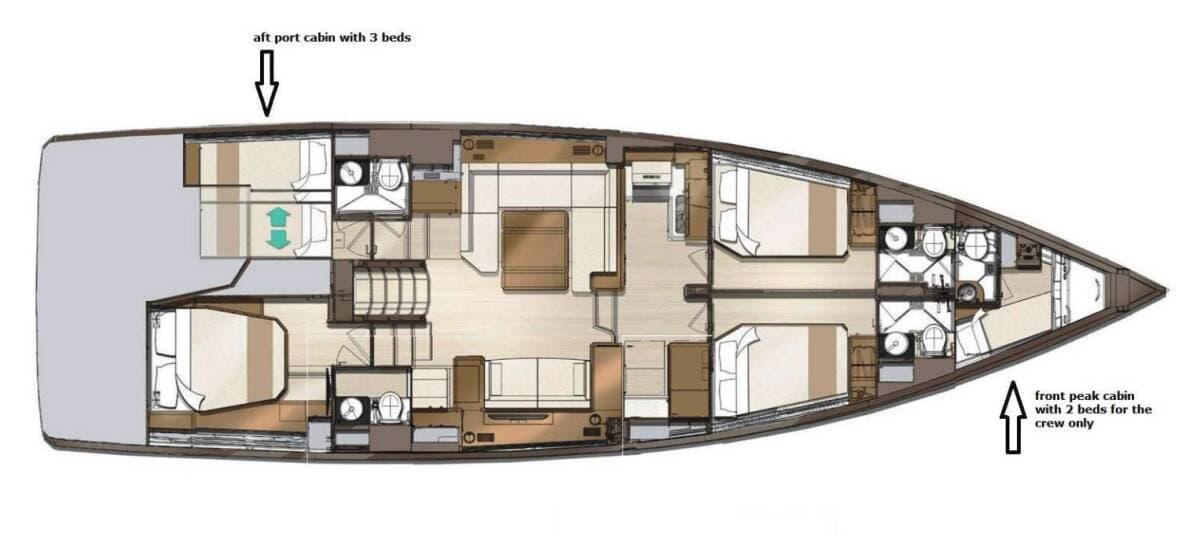 - DeckBimini topCockpit tableCockpit/stern, outside showerDinghyElectric anchor windlassHydraulic gangwayOutboard engineSprayhoodSwimming ladder