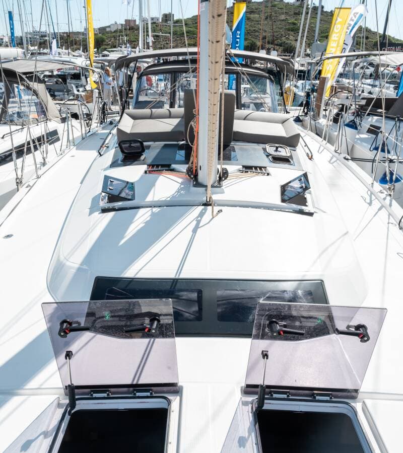 - DeckBimini topCockpit tableCockpit/stern, outside showerDinghyElectric anchor windlassGangwayGrill/Barbecue/PlanchaOutboard engineSprayhoodSwimming ladder