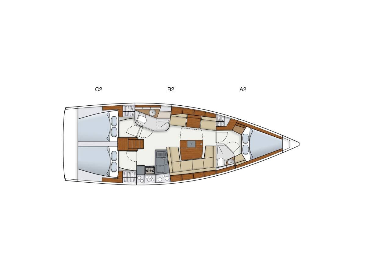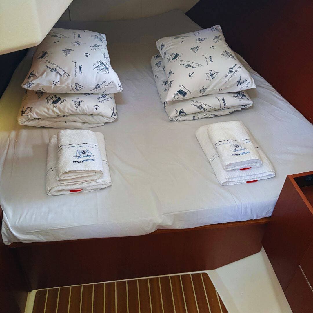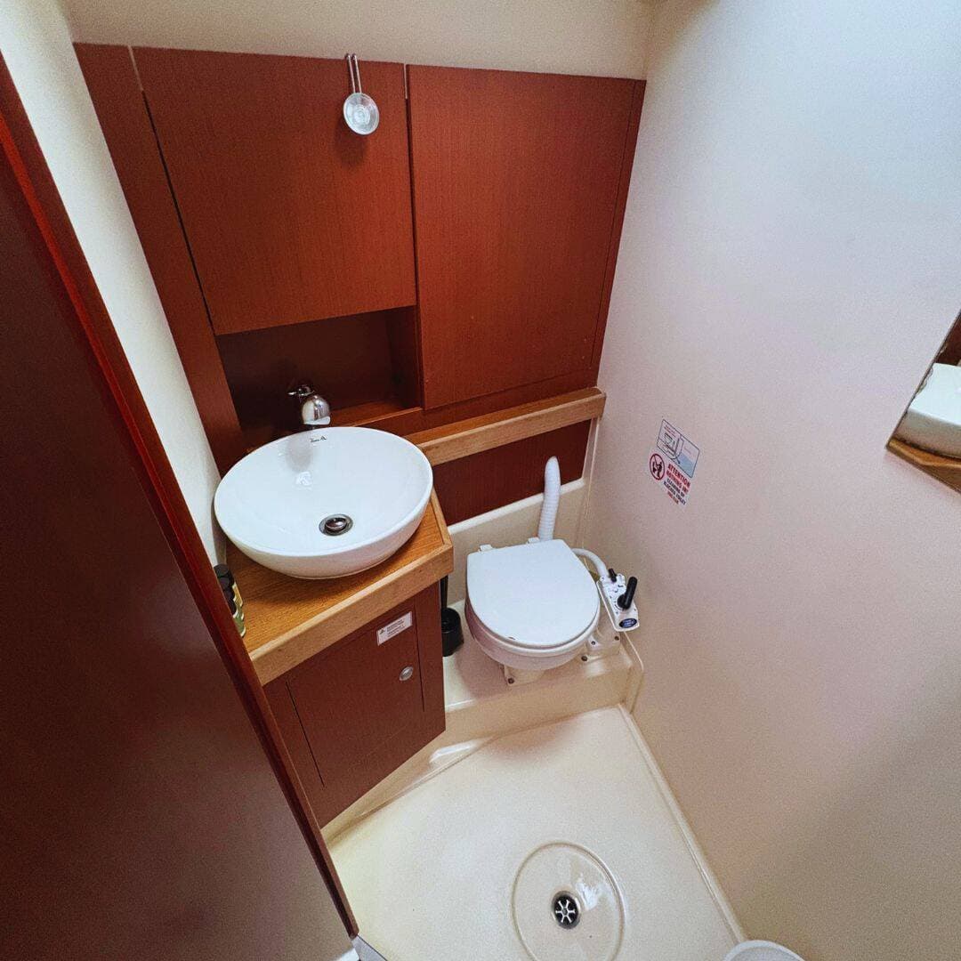 - DeckBathing platformBimini topCockpit tableCockpit/stern, outside showerDinghyElectric anchor windlassSprayhoodTeak cockpit