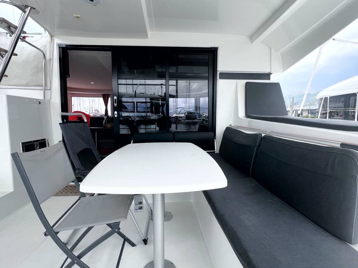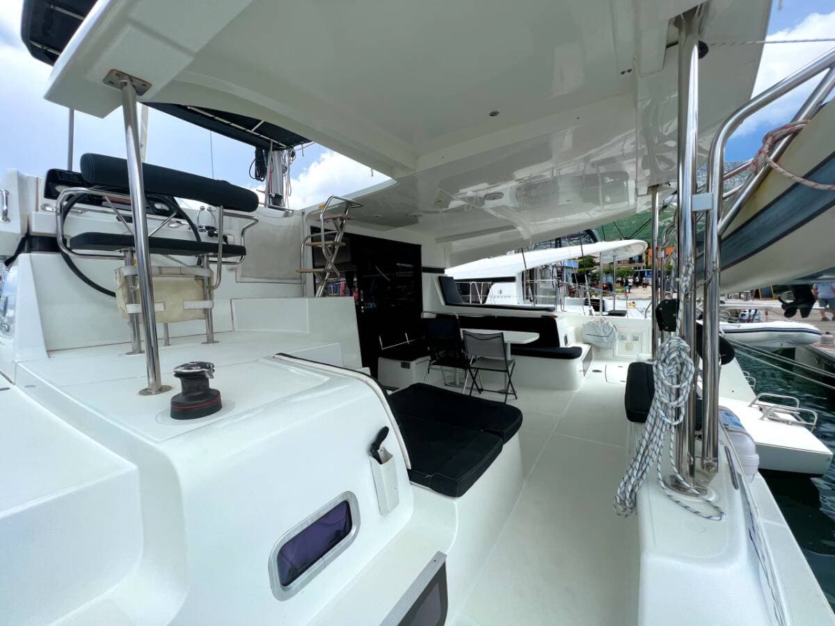 - DeckBilge pump - MechanicBoat hookCockpit tableCockpit/stern, outside showerDinghy Electric anchor windlassFendersGangwayHard Top BiminiMain anchor Mooring ropes Spare anchor (Reserve, Auxiliary anchor) Sun deckSwimming ladderWater hoseWinch handles