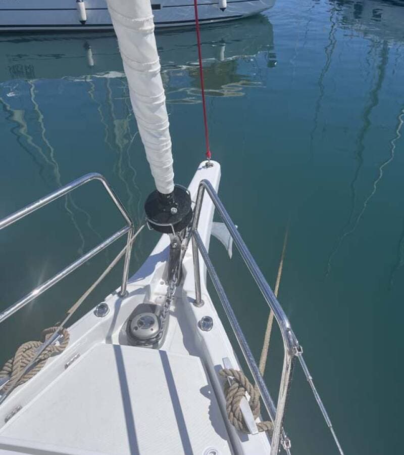 - DeckAnchor lineAnchor swivelBimini topBlack ballBlack conusBoat hookBosun's chair (Safe seat) (boatswain's chair)Canister for waterCockpit tableCockpit/stern, outside showerDinghyDinghy (byboat) pumpElectric anchor windlassFendersGangwayHawserImpeller, V-belt, oilfilterJerry cans for dieselMain anchor Mooring ropes Plastic bucketRepair box for dinghyRound/globular fenderSpare anchor (Reserve, Auxiliary anchor)Spotlight / HeadlightsSprayhoodSpring lineTeak cockpitWater hose