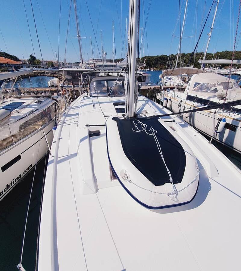 - DeckAnchor lineAnchor swivelBimini topBlack ballBlack conusBoat hookBosun's chair (Safe seat) (boatswain's chair)Canister for waterChairsCockpit fridge Cockpit table with lightCockpit/stern, outside showerDinghyDinghy (byboat) pumpElectric anchor windlassFendersGangwayImpeller, V-belt, oilfilterJerry cans for dieselMain anchorMooring ropes Plastic bucketRepair box for dinghyRound/globular fenderSpare anchor (Reserve, Auxiliary anchor)Spotlight / HeadlightsSprayhoodSpring lineTeak cockpitWater hose