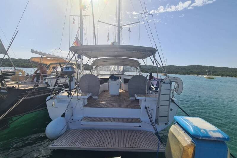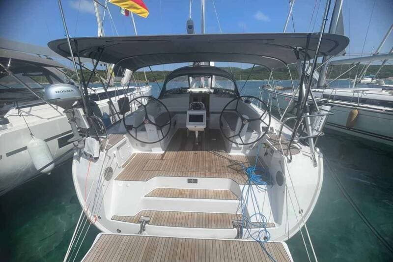 - DeckAnchor lineAnchor swivelBimini topBlack ballBlack conusBoat hookBosun's chair (Safe seat) (boatswain's chair)Cockpit grillCockpit tableCockpit/stern, outside showerDinghyDinghy (byboat) pumpElectric anchor windlassFendersGangwayImpeller, V-belt, oilfilterJerry cans for dieselMain anchorMooring ropes Plastic bucketRepair box for dinghySpare anchor (Reserve, Auxiliary anchor)Spotlight / HeadlightsSprayhoodSpring lineTeak cockpitWater hose