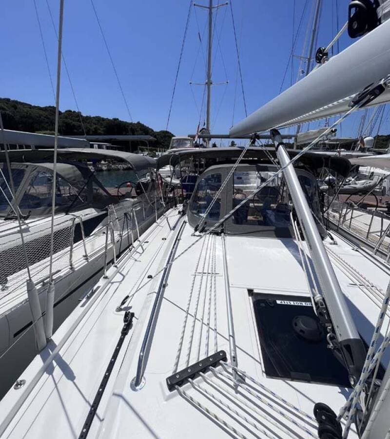 - DeckAnchor lineAnchor swivelBimini topBlack ballBlack conusBoat hookBosun's chair (Safe seat) (boatswain's chair)Canister for waterCockpit tableCockpit/stern, outside showerDinghyDinghy (byboat) pumpElectric anchor windlassFendersGangwayHawserImpeller, V-belt, oilfilterJerry cans for dieselMain anchor Mooring ropesPlastic bucketRepair box for dinghyRound/globular fenderSpare anchor (Reserve, Auxiliary anchor)Spotlight / HeadlightsSprayhoodSpring lineTeak cockpitWater hose