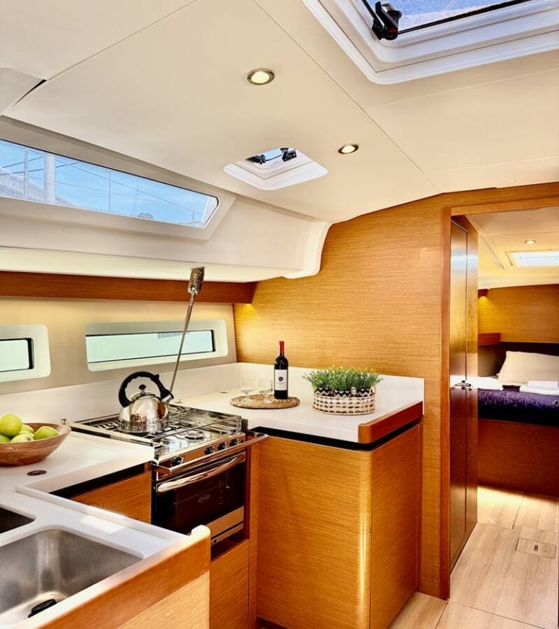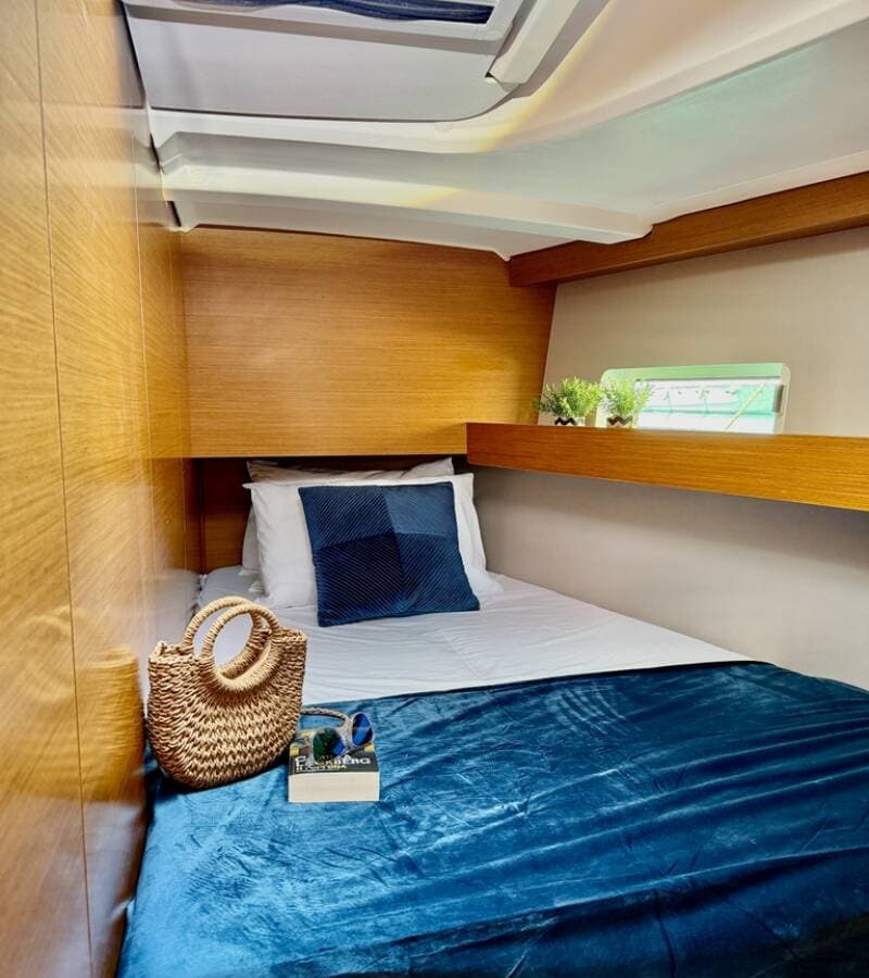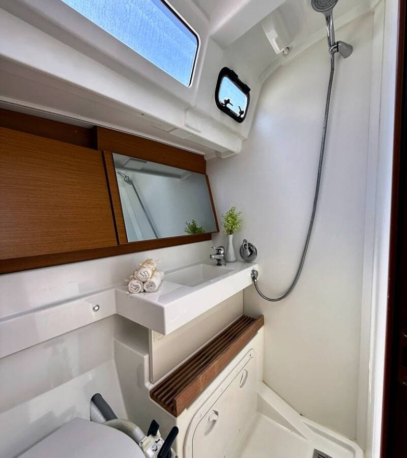 - DeckBimini topCockpit tableCockpit/stern, outside showerDinghyElectric anchor windlassOutboard engineSprayhoodSwimming ladder