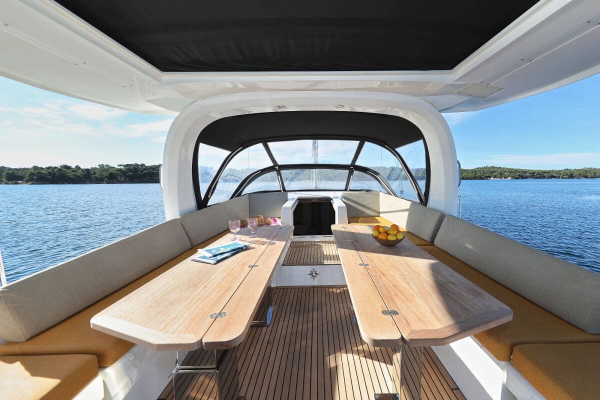 - DeckCockpit tableCockpit/stern, outside showerDinghyFolding cockpit table Hard Top BiminiHydraulic lifting swimming platformSprayhoodTeak cockpit