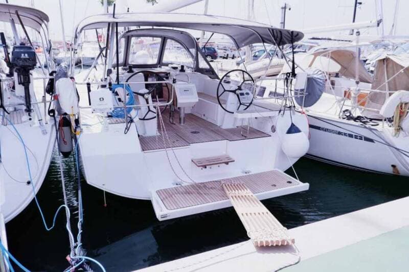 - DeckAnchor swivelBimini topBlack ballBlack conusBoat hookBosun's chair (Safe seat) (boatswain's chair)Cockpit tableCockpit/stern, outside showerDinghyDinghy (byboat) pumpElectric anchor windlassFendersGangwayHawserImpeller, V-belt, oilfilterJerry cans for dieselMain anchor Mooring ropes Plastic bucketRepair box for dinghyRound/globular fenderSpare anchor (Reserve, Auxiliary anchor)Spotlight / HeadlightsSprayhoodTeak cockpitWater hose