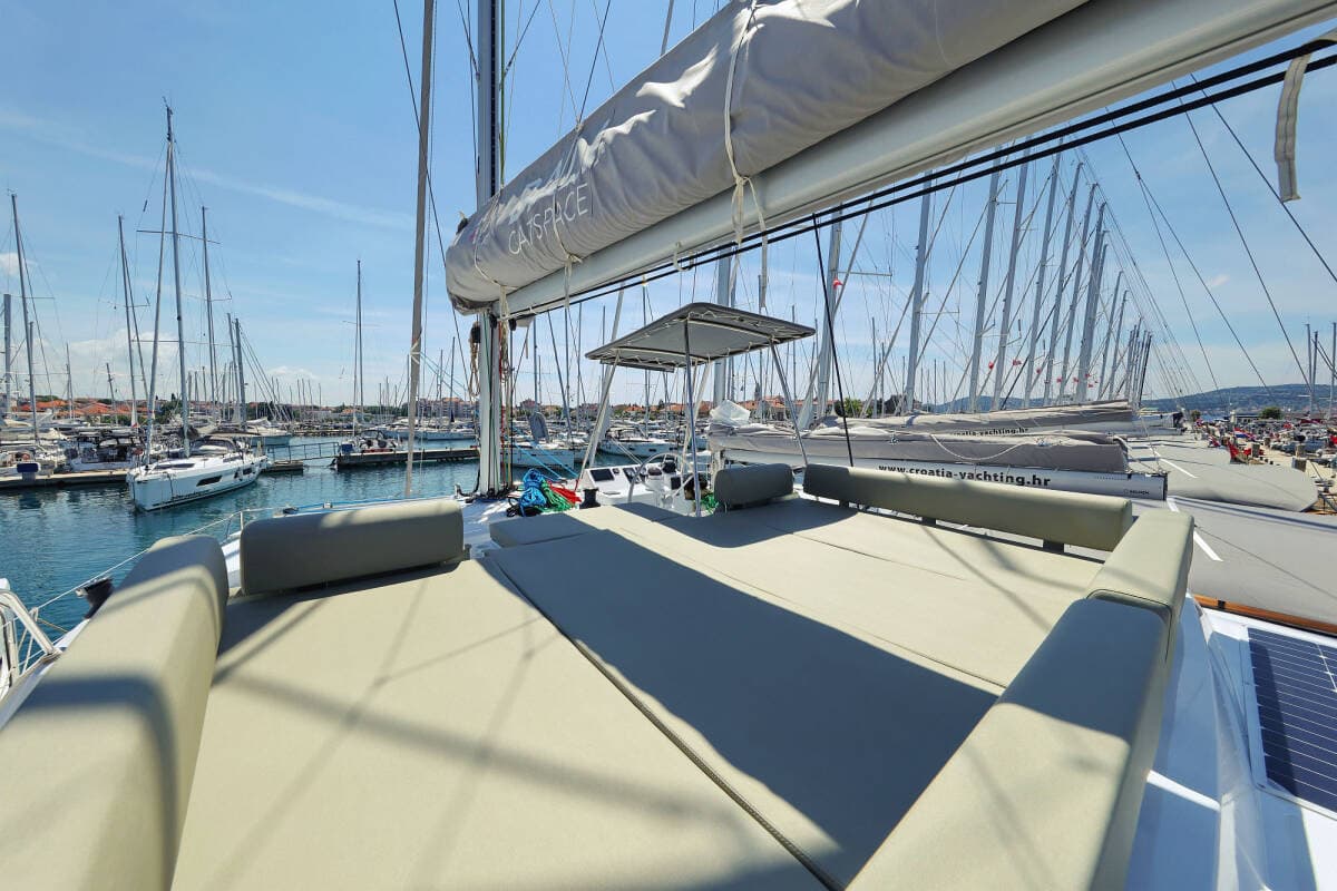 - DeckBathing platformBimini topCockpit tableCockpit/stern, outside showerDinghyFly sunbathing area Forward cockpit