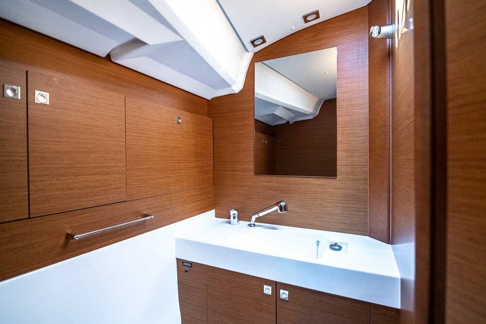 - DeckBimini topCockpit tableCockpit/stern, outside showerDavitElectric anchor windlassGangwayOutboard engineSprayhoodSwimming ladder