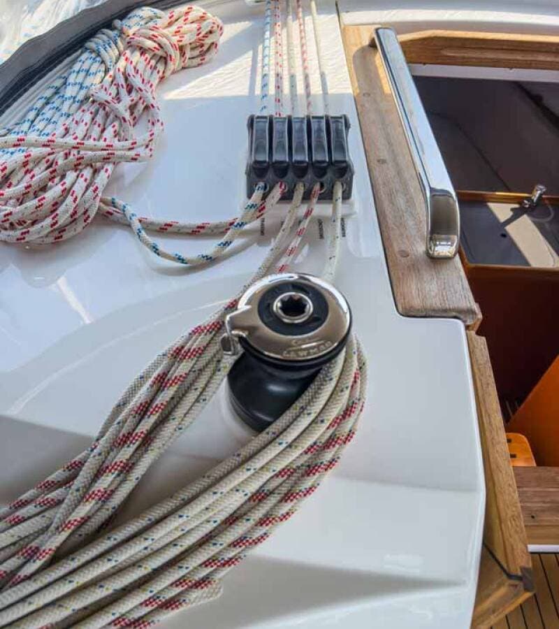- DeckAnchor lineAnchor swivelBimini topBlack ballBlack conusBoat hookBosun's chair (Safe seat) (boatswain's chair)Canister for waterCockpit tableCockpit/stern, outside showerDinghyDinghy (byboat) pumpElectric anchor windlassFendersGangwayHawserImpeller, V-belt, oilfilterJerry cans for dieselMain anchorMooring ropes Plastic bucketRepair box for dinghyRound/globular fenderSpare anchor (Reserve, Auxiliary anchor)Spotlight / HeadlightsSprayhoodSpring lineTeak cockpitWater hose
