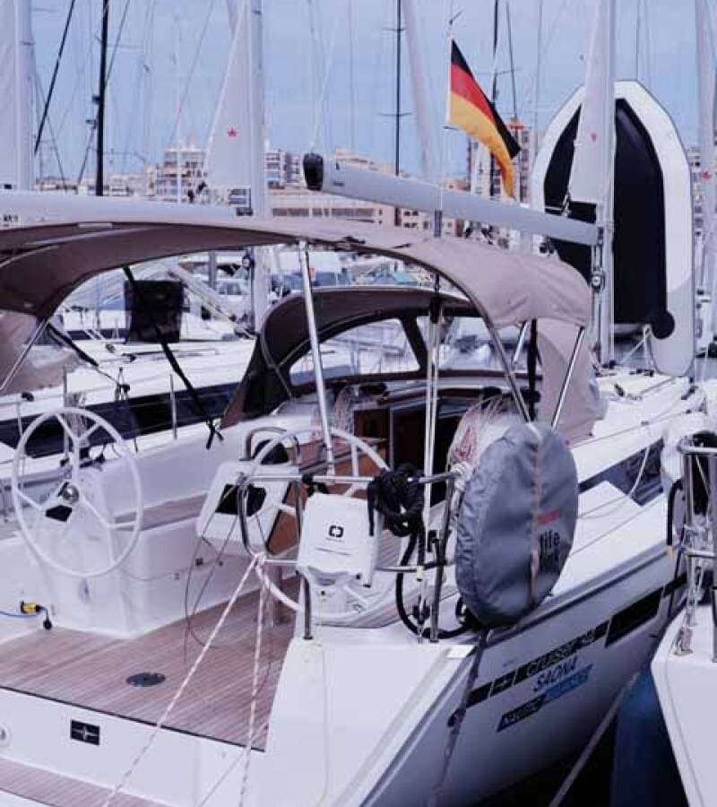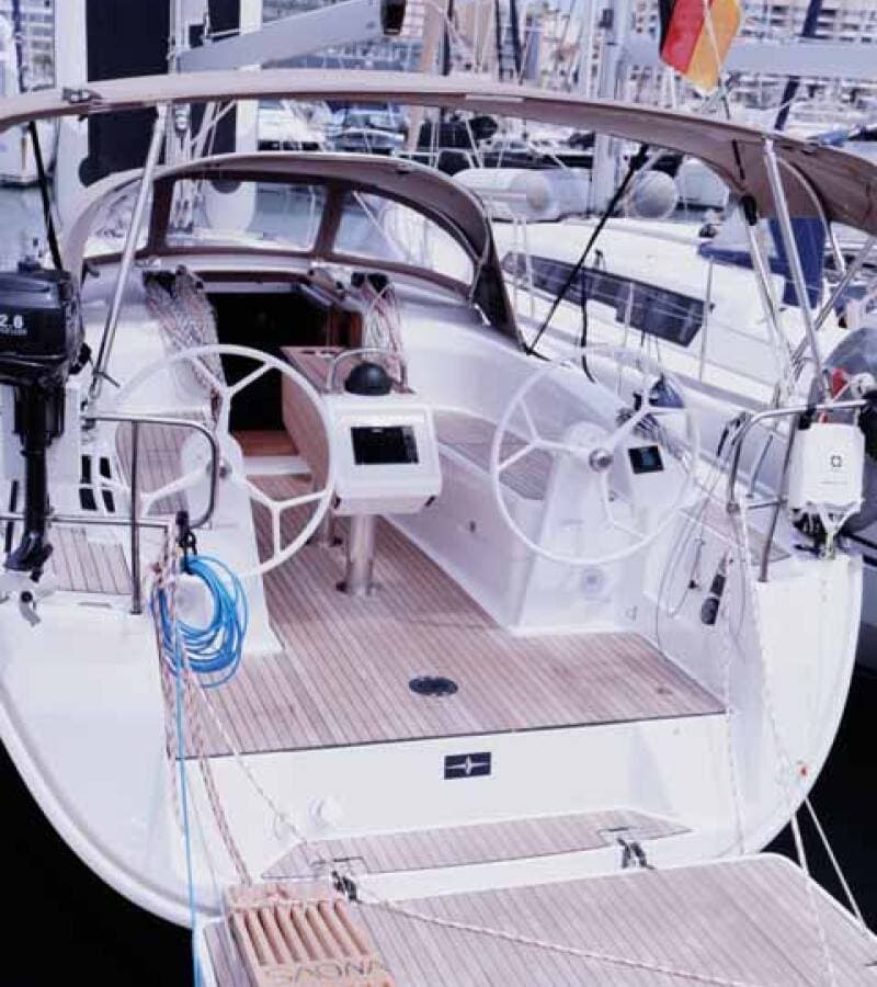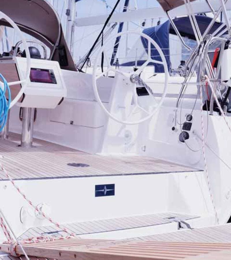 - DeckAnchor swivelBimini topBlack ballBlack conusBoat hookBosun's chair (Safe seat) (boatswain's chair)Cockpit tableCockpit/stern, outside showerDinghyDinghy (byboat) pumpElectric anchor windlassFendersGangwayHawserImpeller, V-belt, oilfilterMain anchorMooring ropes Plastic bucketRepair box for dinghyRound/globular fenderSpare anchor (Reserve, Auxiliary anchor)Spotlight / HeadlightsSprayhoodTeak cockpitWater hose