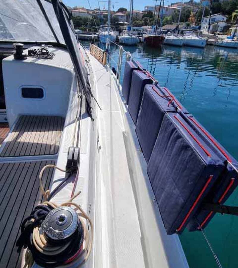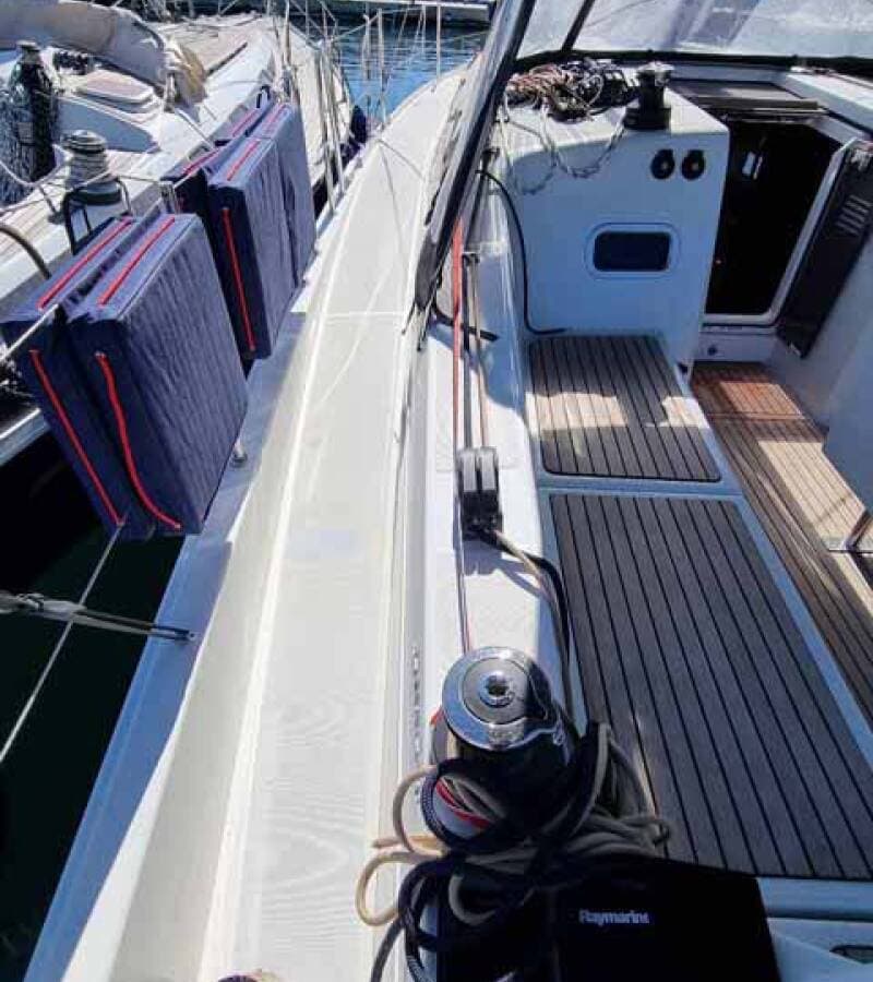 - DeckBimini topBlack ballBlack conusBoat hookBosun's chair (Safe seat) (boatswain's chair)Cockpit tableCockpit/stern, outside showerDinghyDinghy (byboat) pumpElectric anchor windlassFendersGangwayImpeller, V-belt, oilfilterMain anchor Mooring ropes Repair box for dinghyRound/globular fenderSpare anchor (Reserve, Auxiliary anchor)Spotlight / HeadlightsSprayhoodTeak cockpitWater hose