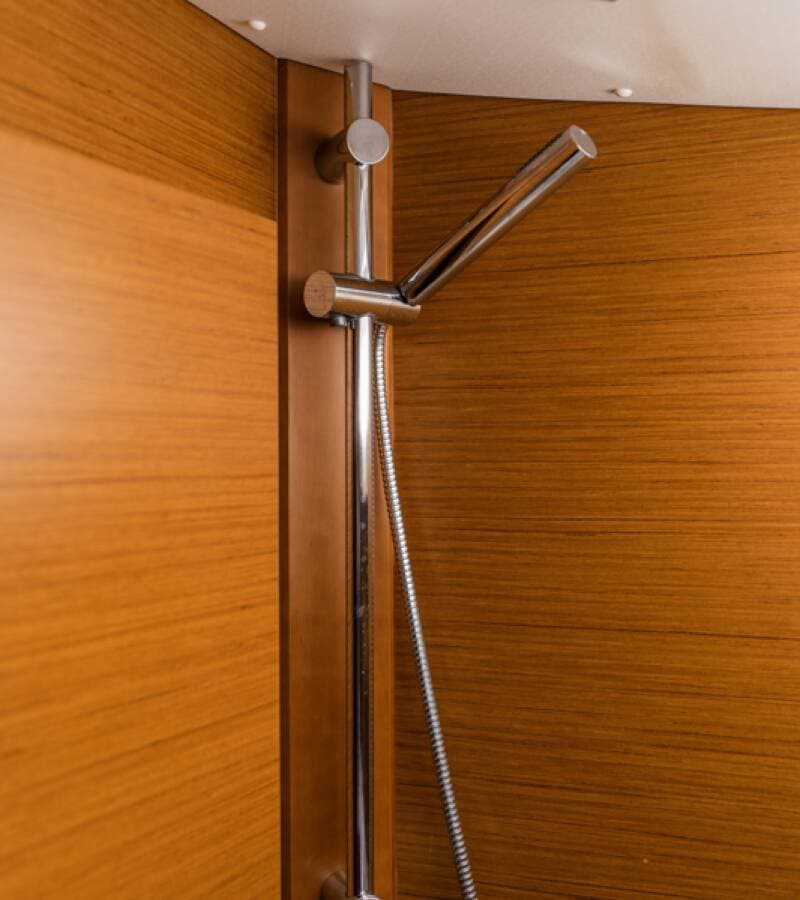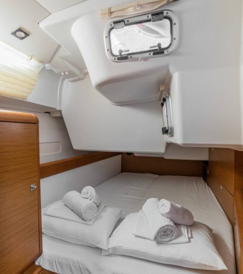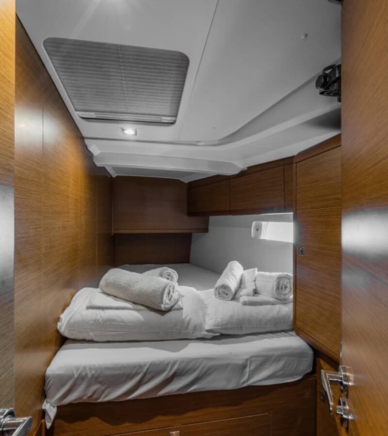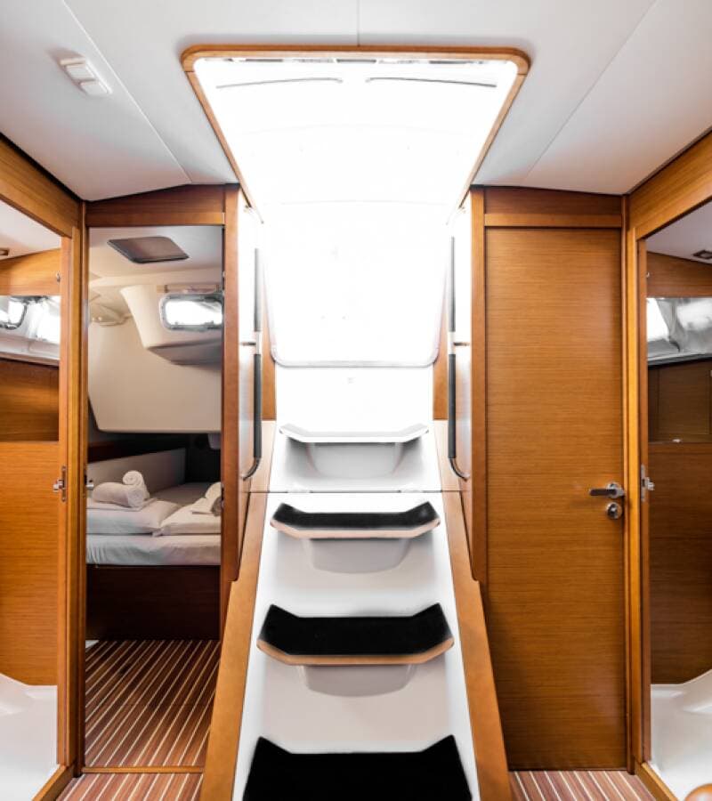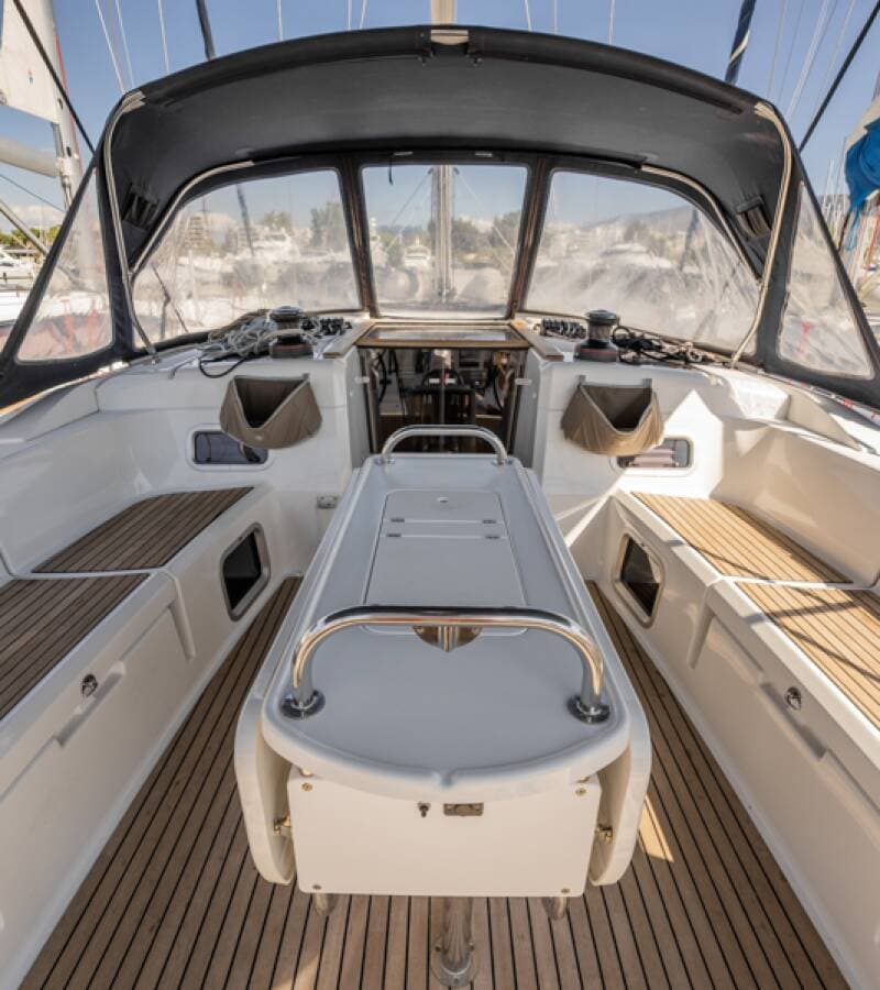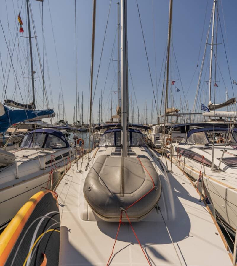- DeckBimini topCockpit tableCockpit/stern, outside showerDinghyElectric anchor windlassHydraulic gangwayOutboard engineSprayhoodSwimming ladder