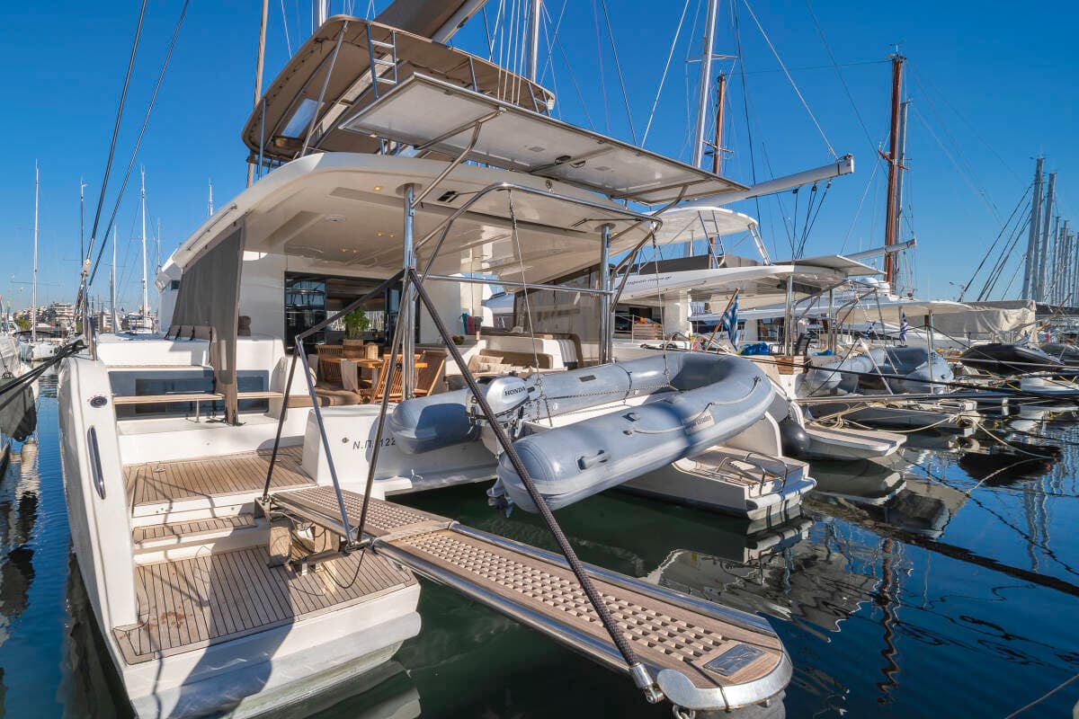 - DeckBimini topBlack ballCockpit tableCockpit/stern, outside showerDinghy with outboard engineElectric anchor windlassFendersHydraulic gangwaySprayhoodSwimming ladderTeak cockpit