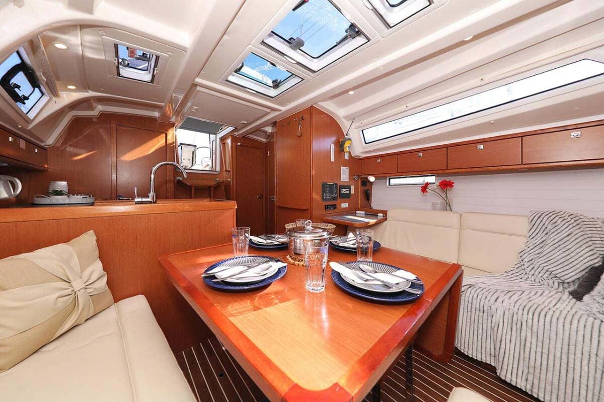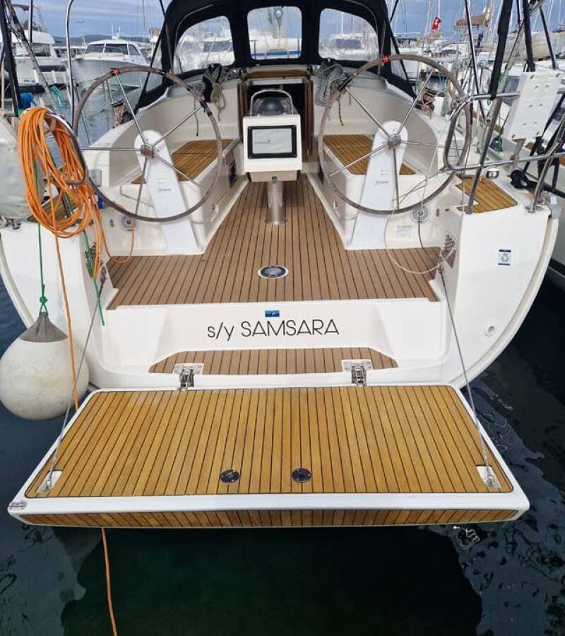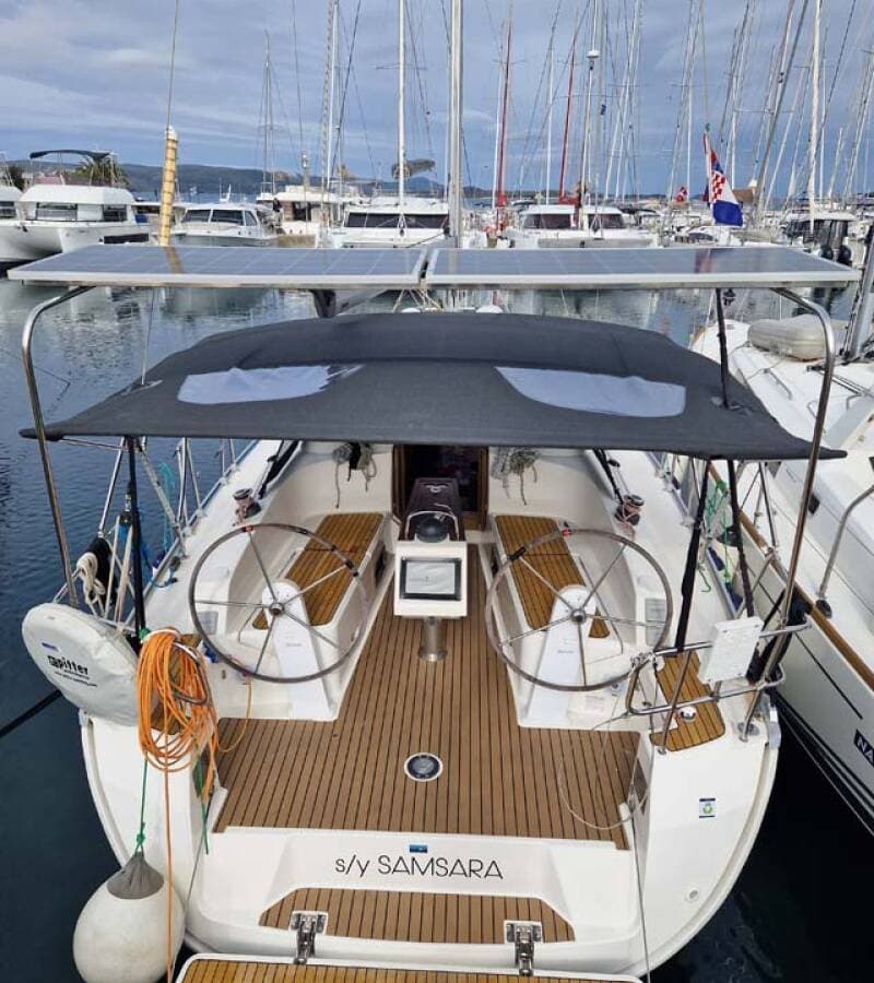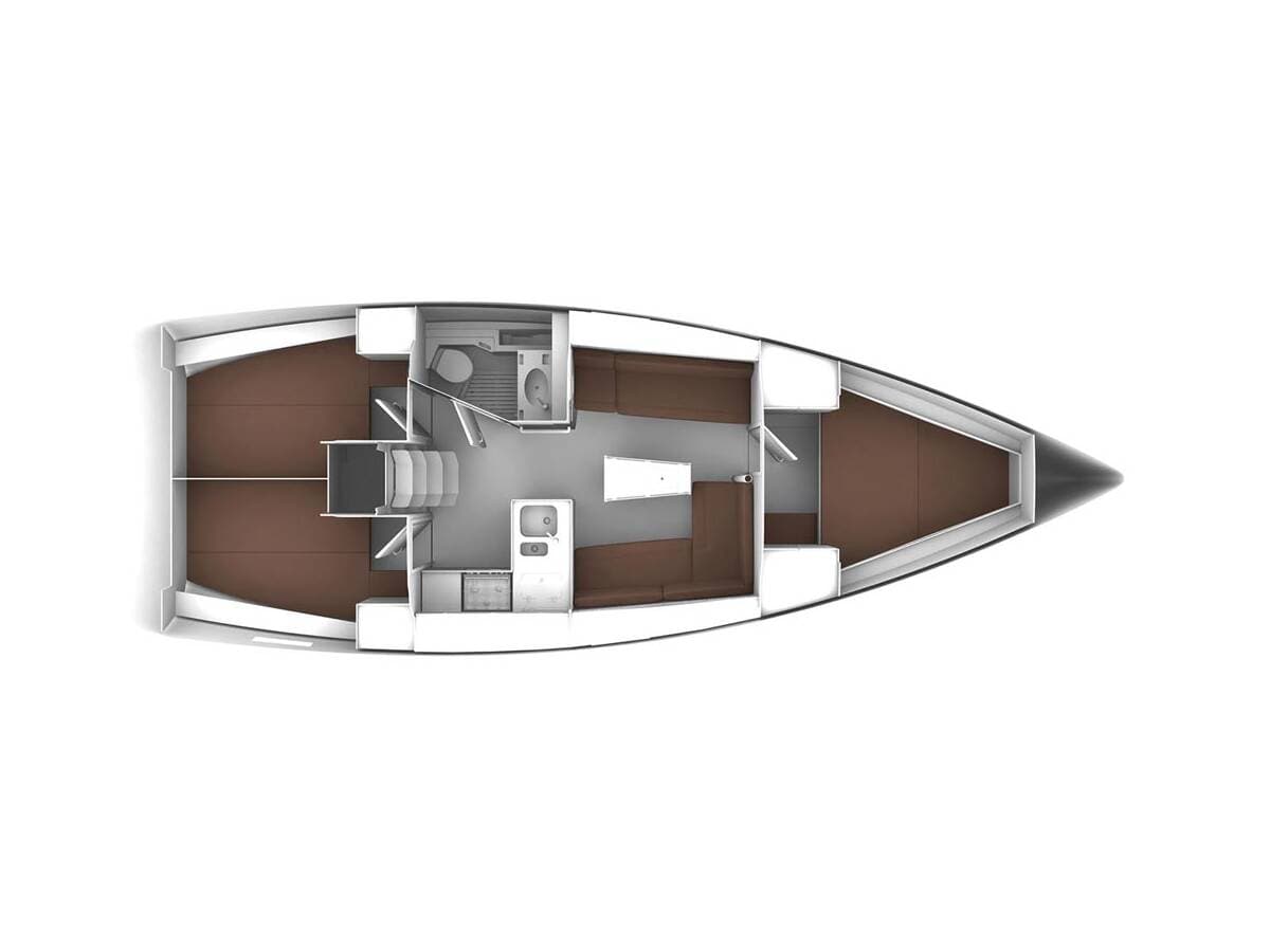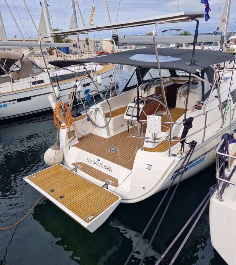 - DeckBathing platformBimini top Cockpit tableCockpit/stern, outside showerDinghyElectric anchor windlassGangwayMain anchor Sprayhood