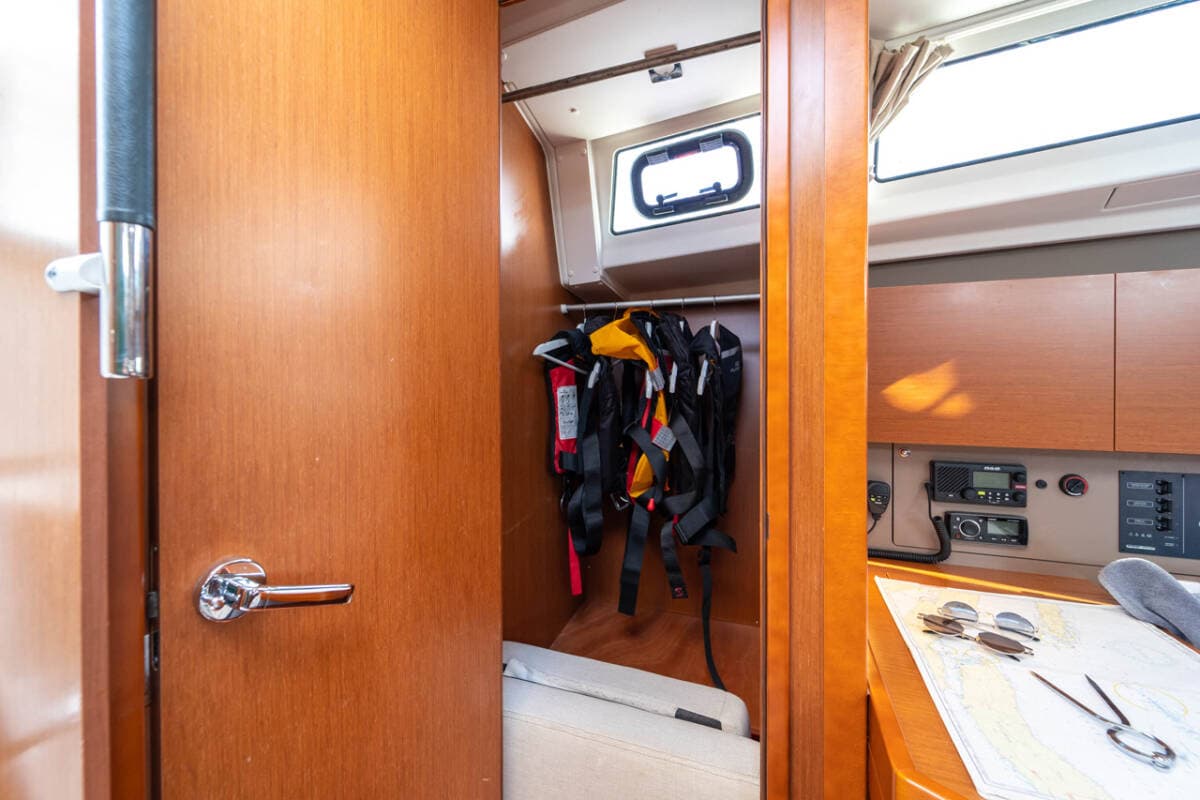- SafetyFire extinguisher First aid kit FlashlightFog hornLife attolLife belts (Safety harness)Life buoy + Flashing lightLife jacketsSet of tools VHF radio Wire (shroud) cutter