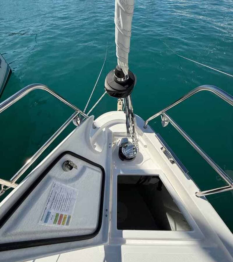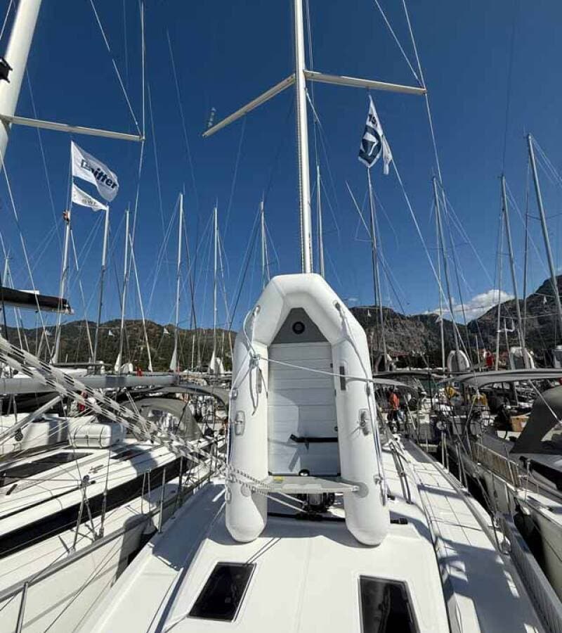 - DeckAnchor lineAnchor swivelBimini topBlack ballBlack conusBoat hookBosun's chair (Safe seat) (boatswain's chair)Cockpit tableCockpit/stern, outside showerDinghyDinghy (byboat) pumpElectric anchor windlassFendersGangwayHawserImpeller, V-belt, oilfilterMain anchorMooring ropes Plastic bucketRepair box for dinghyRound/globular fenderSpare anchor (Reserve, Auxiliary anchor)Spotlight / HeadlightsSprayhoodSpring lineWater hose