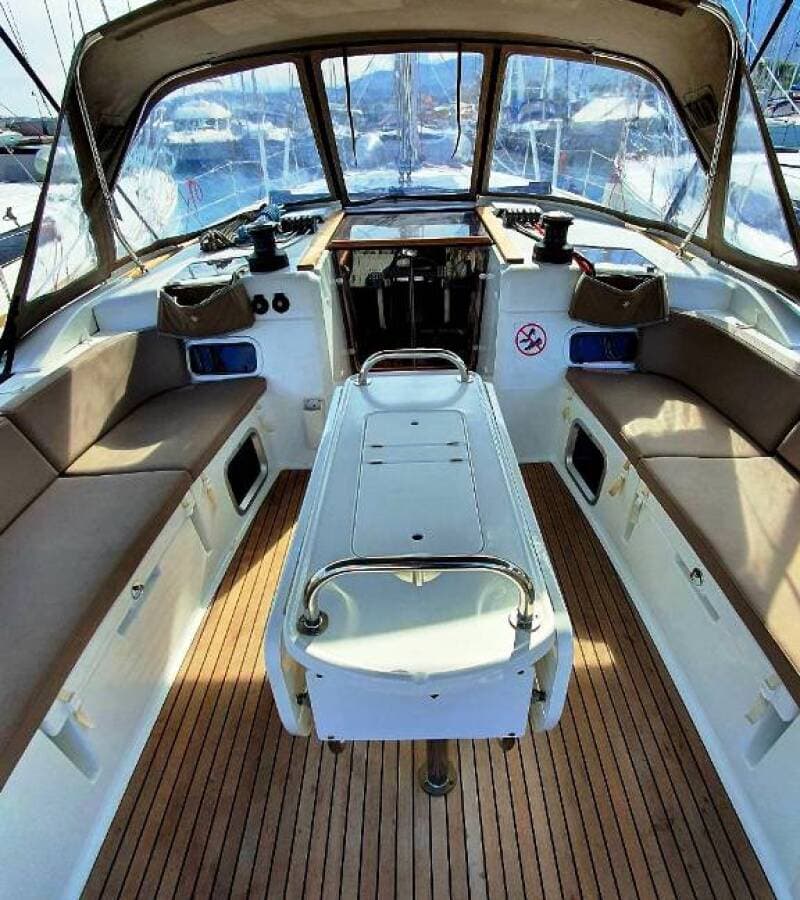 - DeckBimini topCockpit tableCockpit/stern, outside showerDinghyElectric anchor windlassHydraulic gangwayOutboard engineSprayhoodSwimming ladder