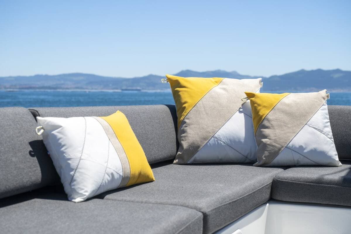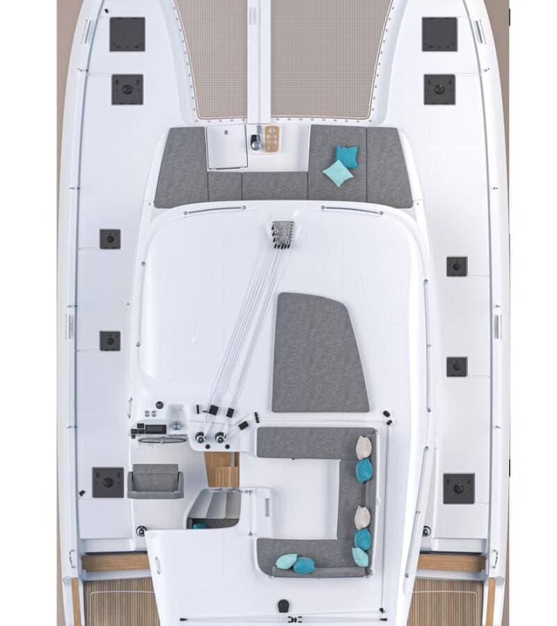 - DeckBimini topCockpit fridge Cockpit/stern, outside showerDinghy with outboard engine Electric anchor windlassTeak cockpit