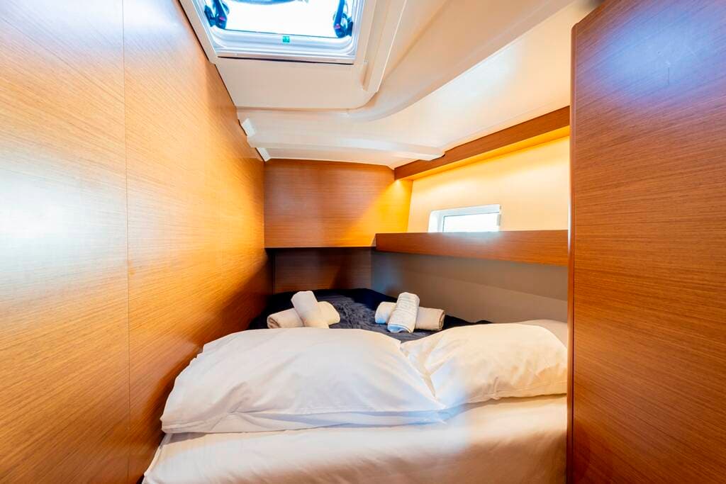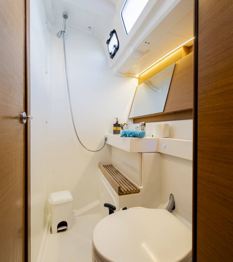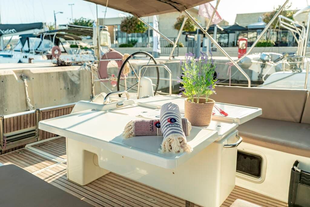 - DeckBimini topCockpit tableCockpit/stern, outside showerDinghyElectric anchor windlassOutboard engineSprayhoodSwimming ladder