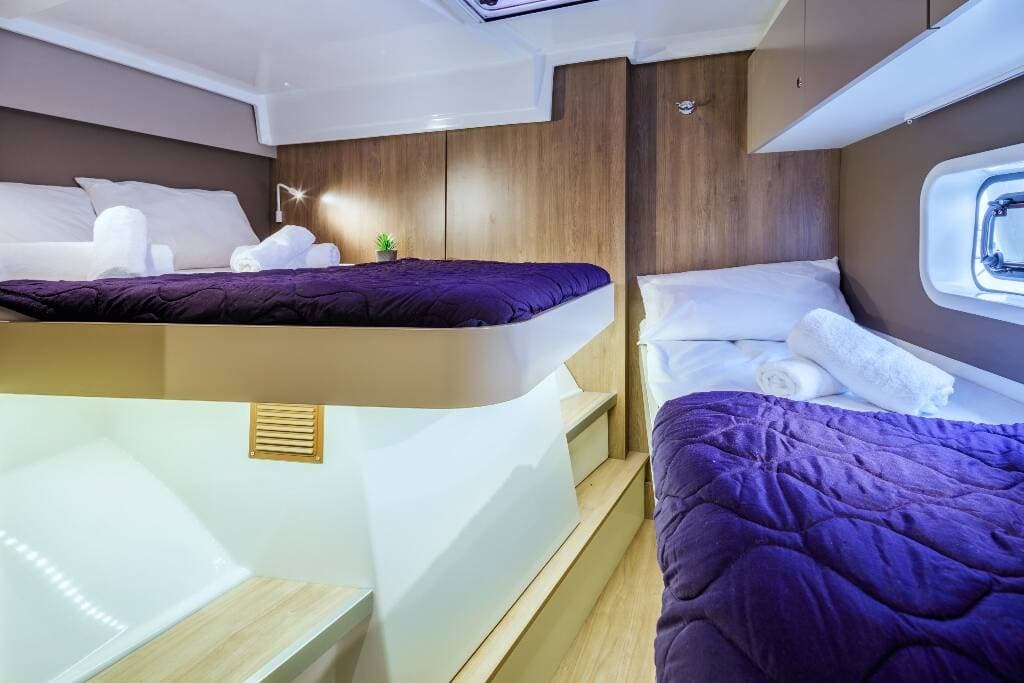 - DeckBimini topCockpit/stern, outside showerDavitDinghyElectric anchor windlassGangwayOutboard engineSwimming ladder