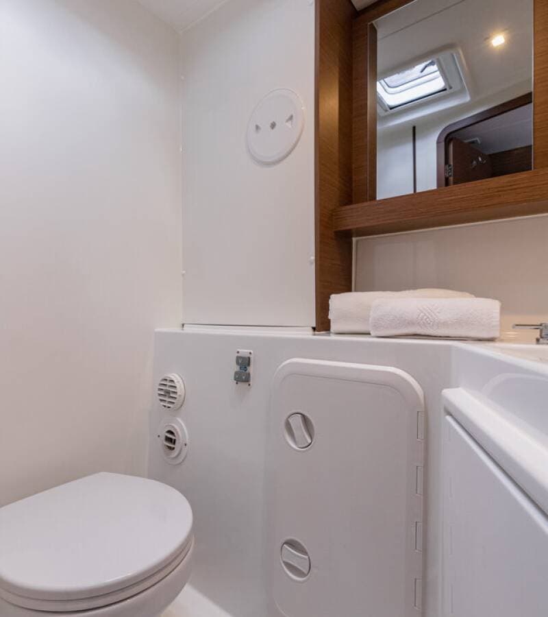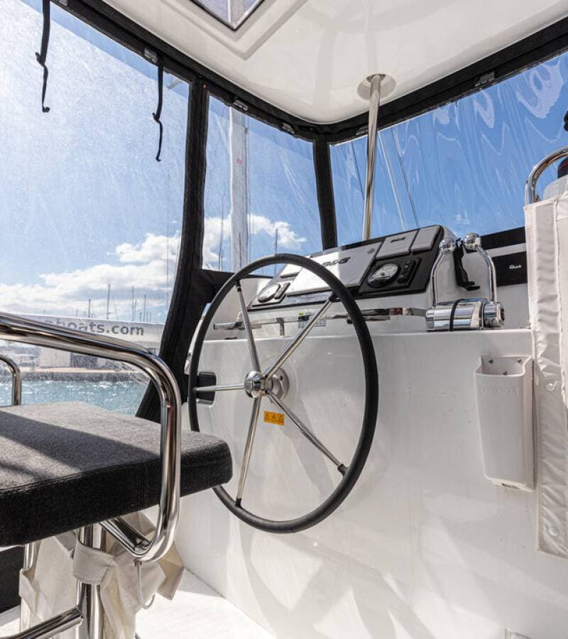 - DeckBilge pump - MechanicBimini topCockpit tableCockpit/stern, outside showerDinghy Electric anchor windlassGangway Outboard engine SprayhoodTeak cockpit