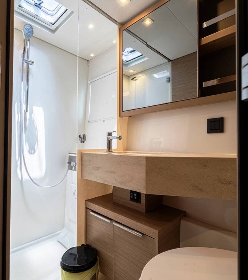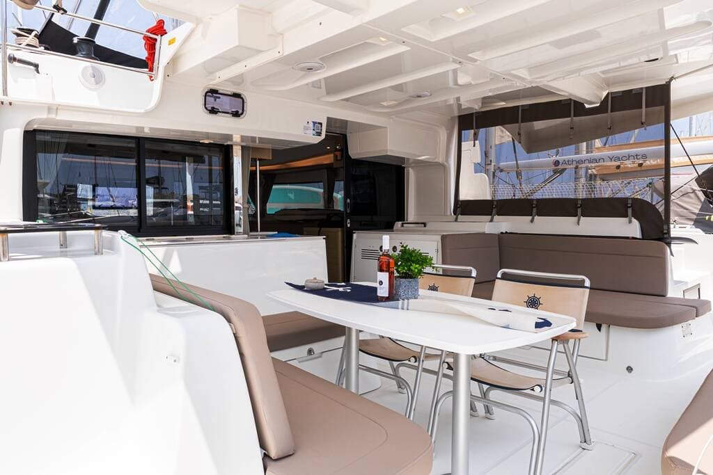 - DeckBimini topCockpit tableCockpit/stern, outside showerDinghyElectric anchor windlassGangway Outboard engineSwimming ladder