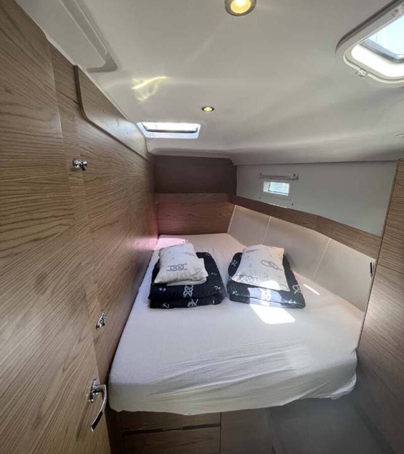 - DeckAnchor lineBathing platformBimini top Black ballBlack conusBoat hookBosun's chair (Safe seat) (boatswain's chair)Canister for waterCockpit tableCockpit/stern, outside showerDinghyDinghy (byboat) pumpElectric anchor windlassFendersGangwayImpeller, V-belt, oilfilterJerry cans for dieselMain anchorMooring ropes Plastic bucketRemote control for anchor winch with chain counter at helmRepair box for dinghyRound/globular fenderSpare anchor (Reserve, Auxiliary anchor)Spotlight / HeadlightsSprayhood Spring lineTeak cockpitWater hose