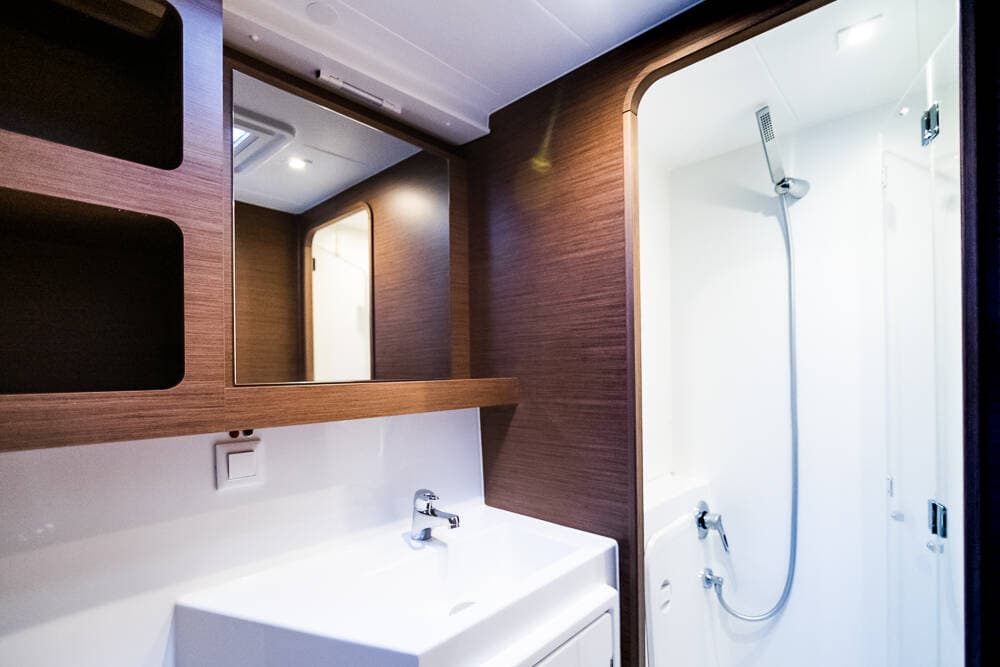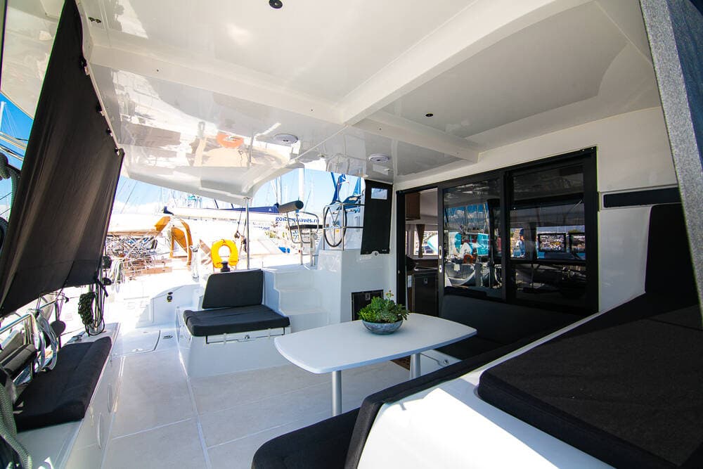 - DeckBimini topCockpit tableCockpit/stern, outside showerDinghyGangwayGrill/Barbecue/PlanchaOutboard engineSprayhoodSwimming ladder