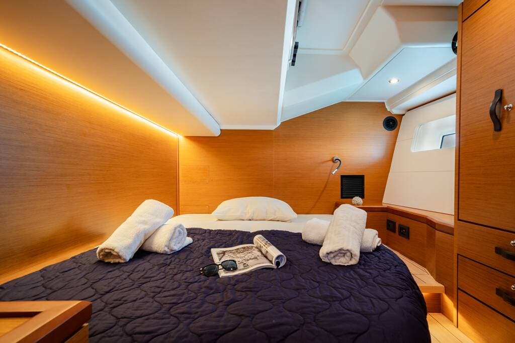 - DeckBimini topCockpit tableCockpit/stern, outside showerDinghyElectric anchor windlassHydraulic gangwayOutboard engineSprayhoodSwimming ladder