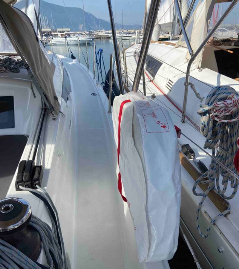 - DeckAnchor lineAnchor swivelBimini topBlack ballBlack conusBoat hookBosun's chair (Safe seat) (boatswain's chair)Canister for waterCockpit table with lightCockpit/stern, outside showerDinghyDinghy (byboat) pumpElectric anchor windlassFendersGangwayHawserImpeller, V-belt, oilfilterJerry cans for dieselMain anchorMooring ropes Plastic bucketRepair box for dinghyRound/globular fenderSpare anchor (Reserve, Auxiliary anchor)Spotlight / HeadlightsSprayhoodSpring lineTeak cockpitWater hose