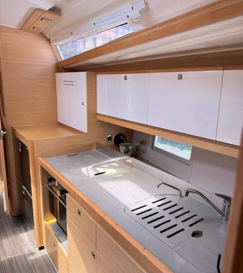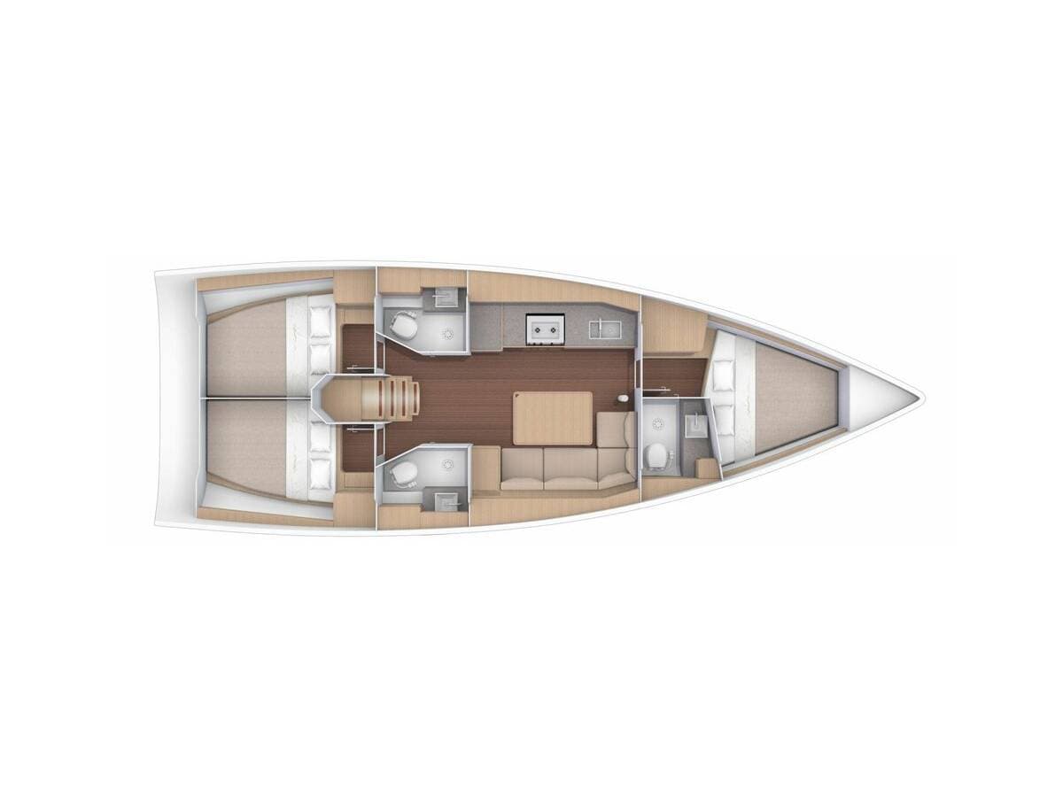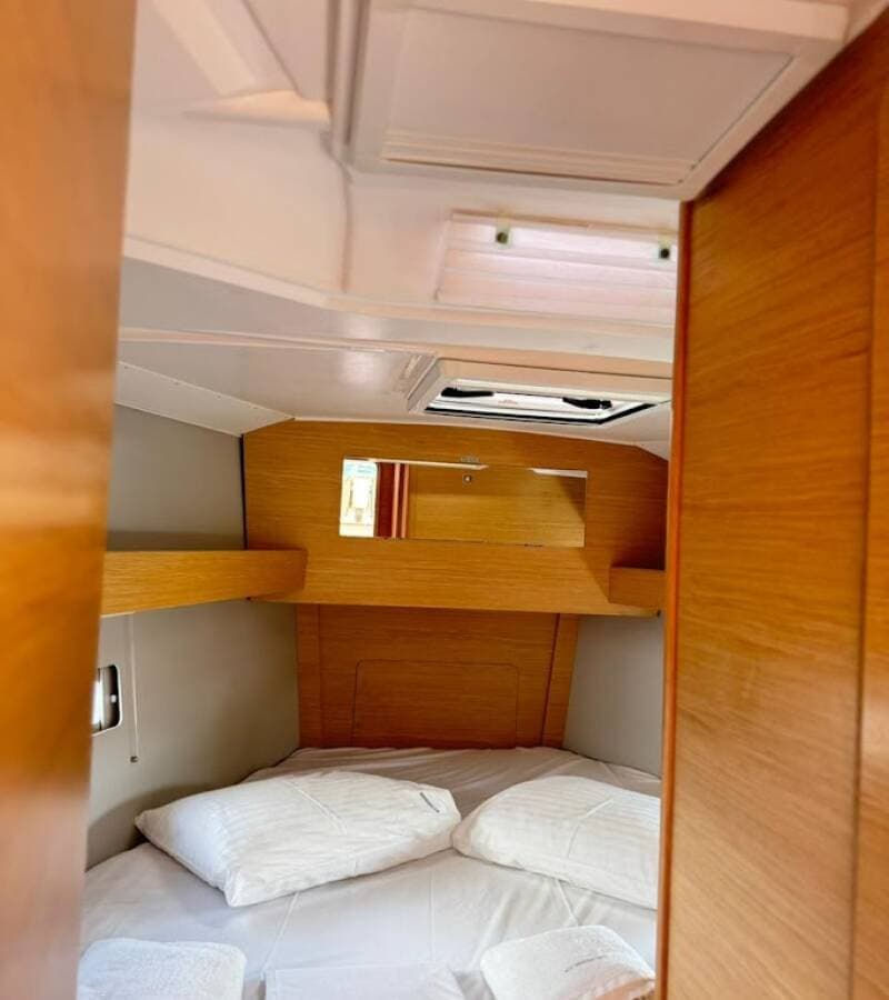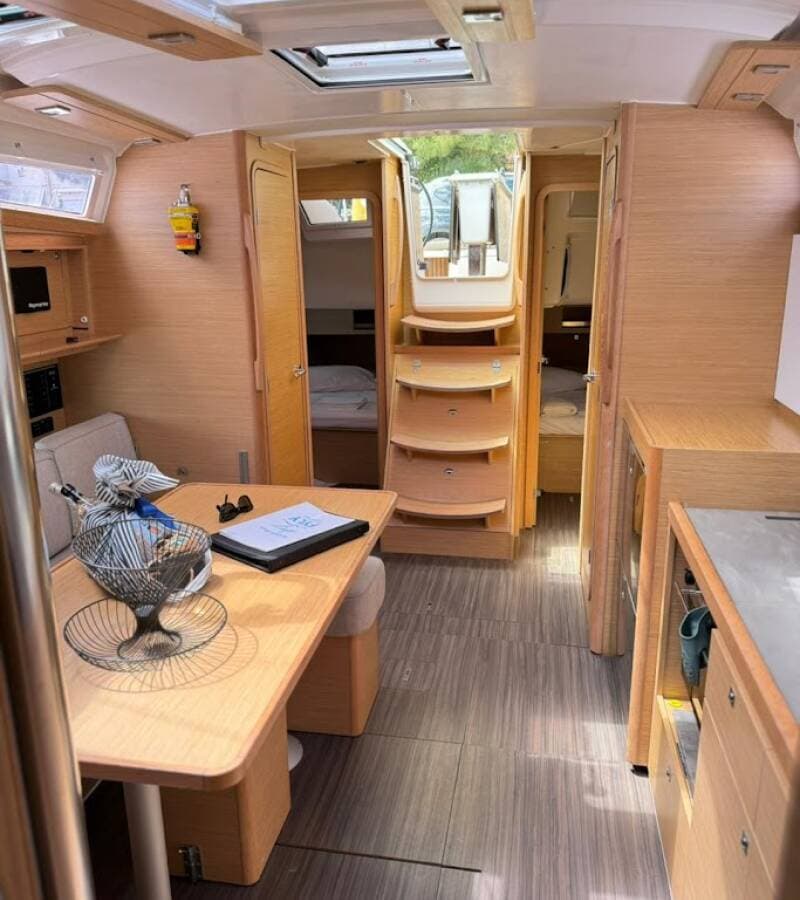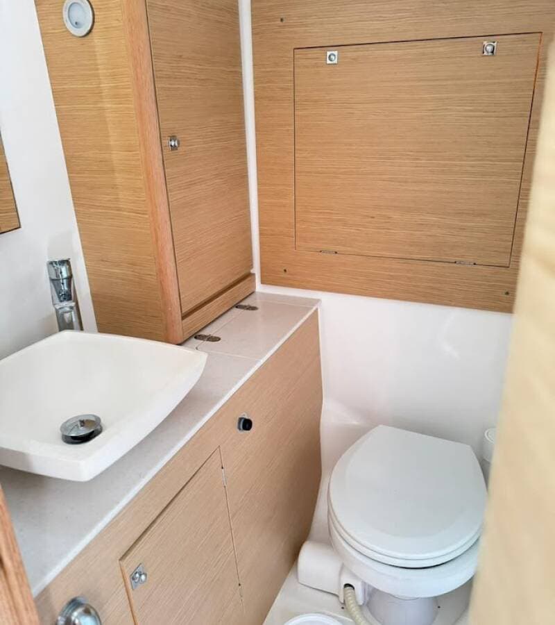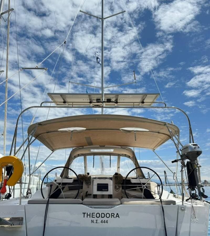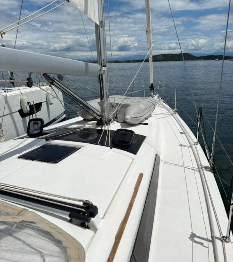 - DeckBathing platformBimini topCockpit tableCockpit/stern, outside showerDinghy Grill/Barbecue/PlanchaOutboard engine SprayhoodSwimming ladderTeak deck