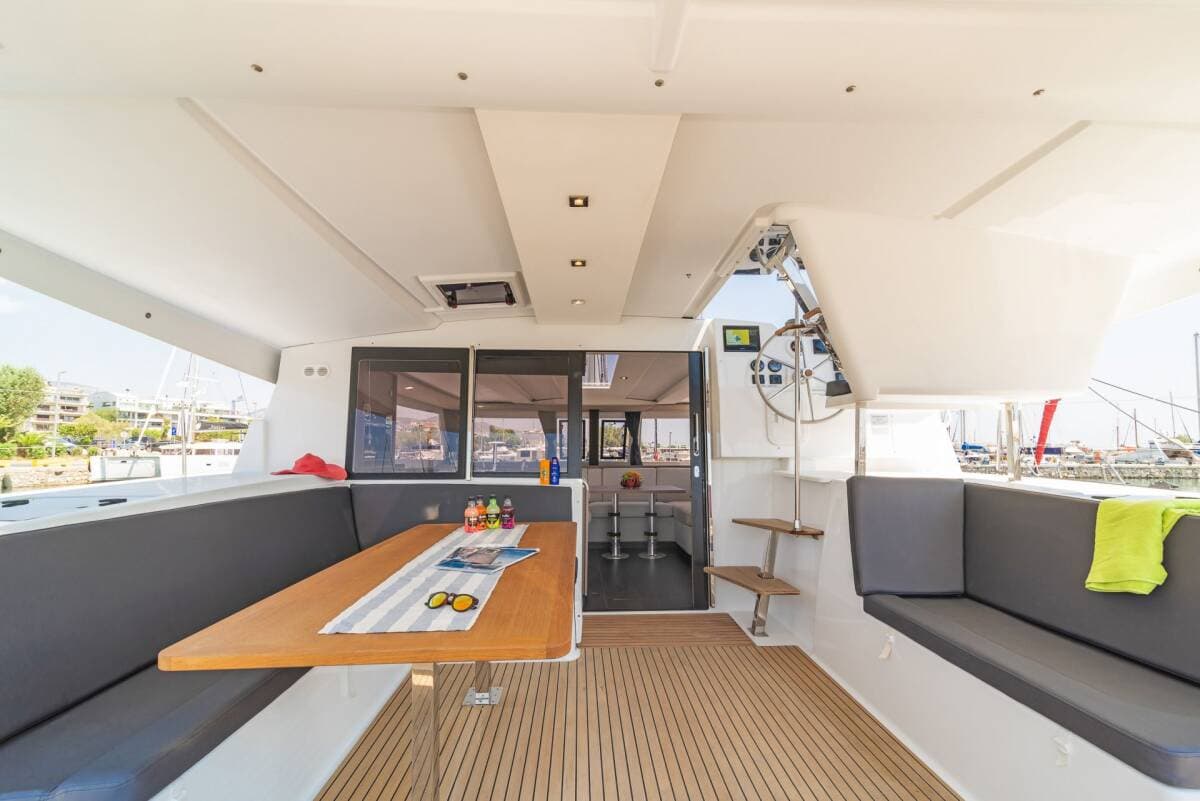 - DeckAnchorBilge pump - MechanicBimini topCockpit tableCockpit/stern, outside showerDinghy with outboard engineElectric anchor windlassFendersGangwaySpare anchor (Reserve, Auxiliary anchor)Sprayhood
