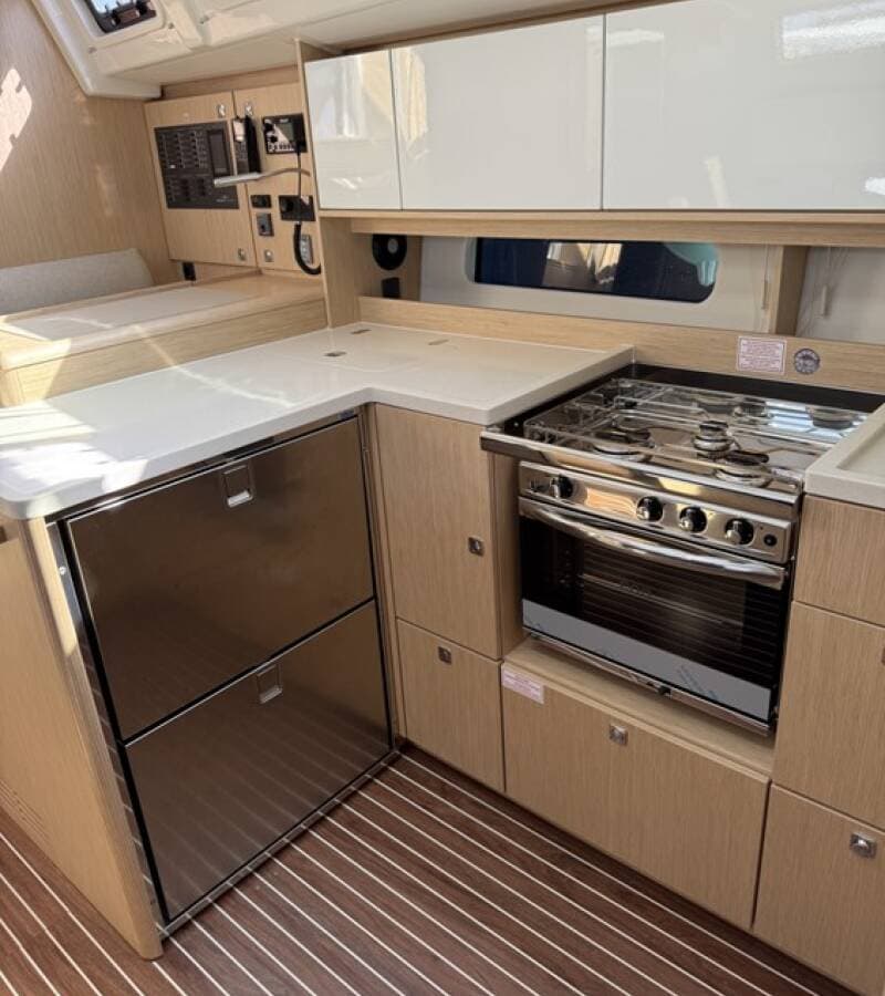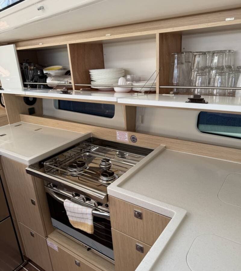 - GalleyDishwasherGas bottlesHot waterKitchen utensils (Galley equipment, cutlery)Refrigerator