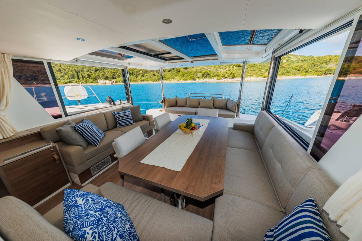 - DeckBathing platformBimini topCamera Cockpit tableCockpit/stern, outside showerDinghy with outboard engine Electric anchor windlassForward cockpit Grill/Barbecue/PlanchaHydraulic gangwayOutboard engineTeak cockpit