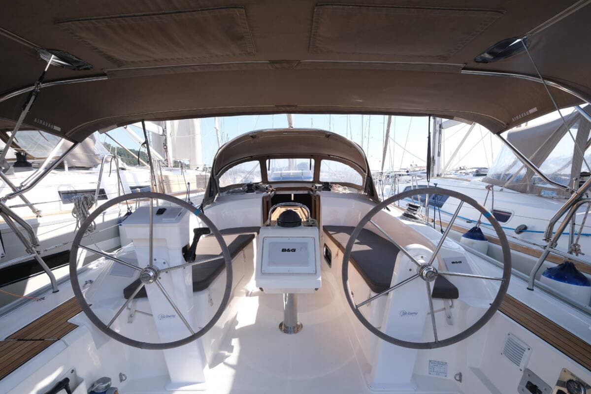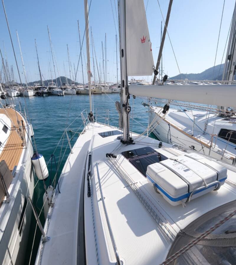 - DeckAnchor lineAnchor swivelBathing platformBimini topBlack ballBlack conusBoat hookBosun's chair (Safe seat) (boatswain's chair)Cockpit tableCockpit/stern, outside showerDinghyDinghy (byboat) pumpElectric anchor windlass FendersGangwayImpeller, V-belt, oilfilterMain anchor Mooring ropes Plastic bucketRepair box for dinghyRound/globular fenderSpare anchor (Reserve, Auxiliary anchor)Spotlight / HeadlightsSprayhoodSpring lineTeak cockpitWater hose