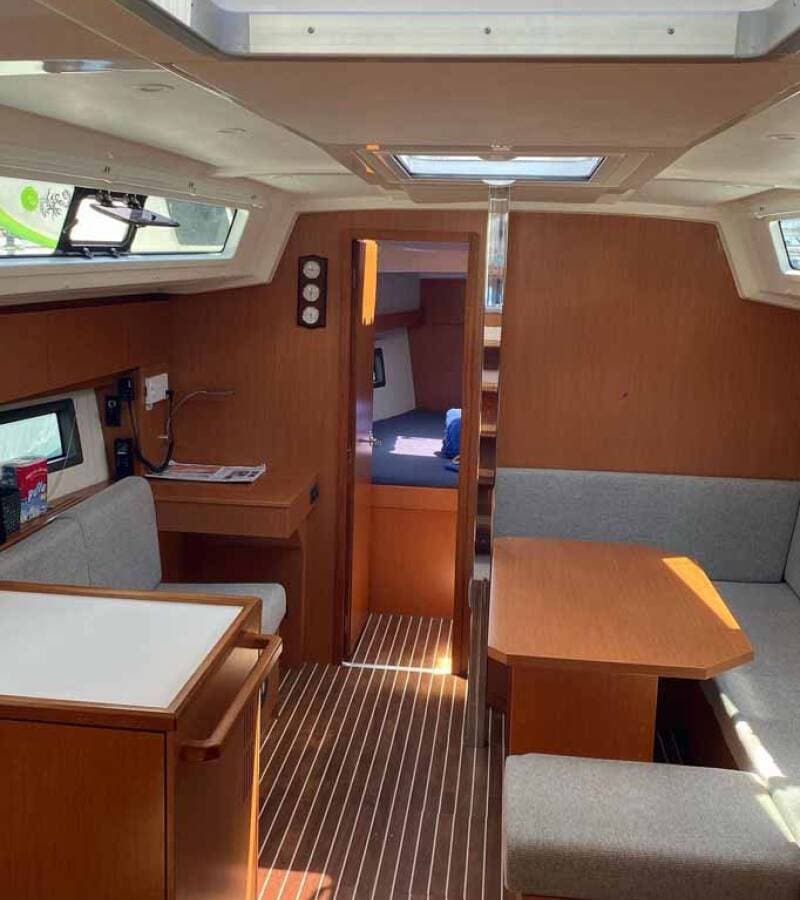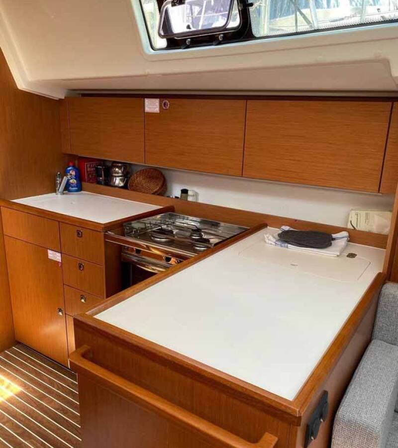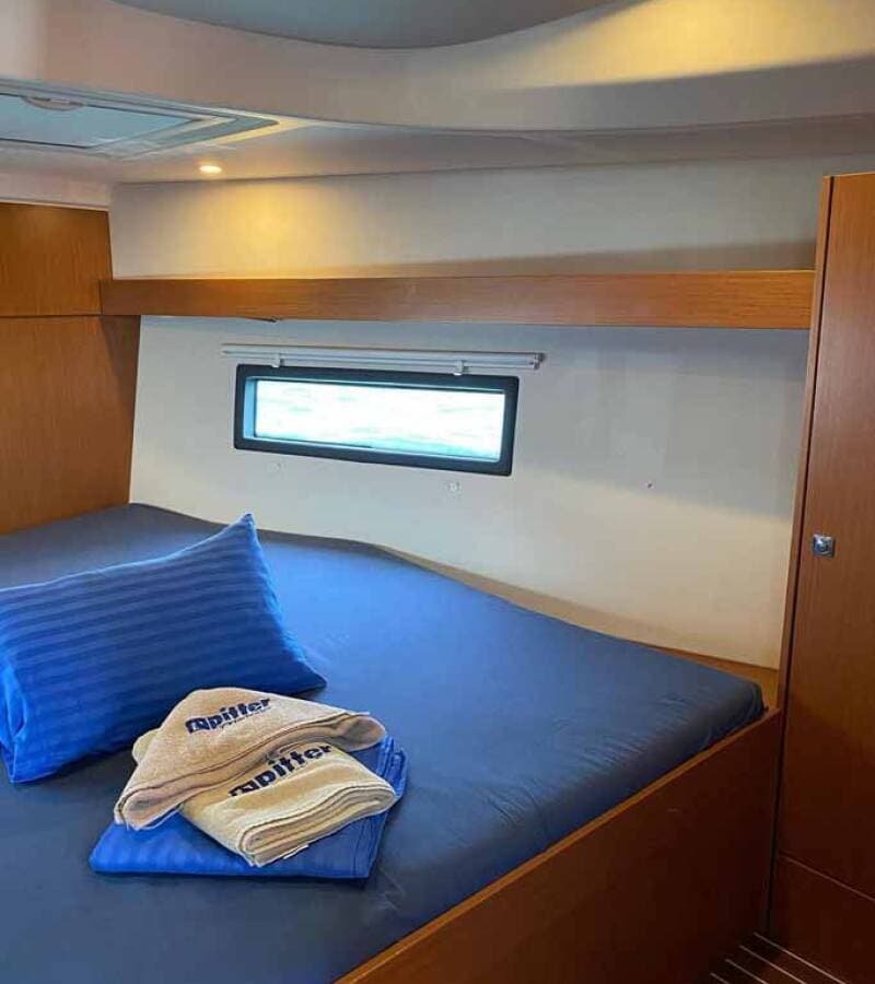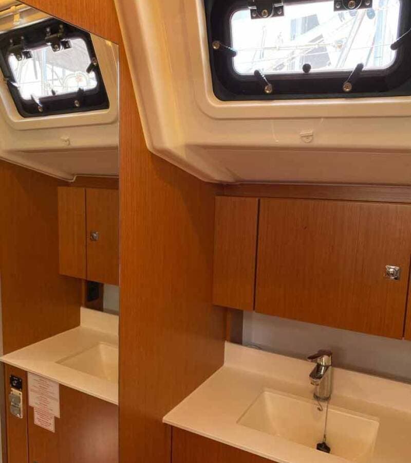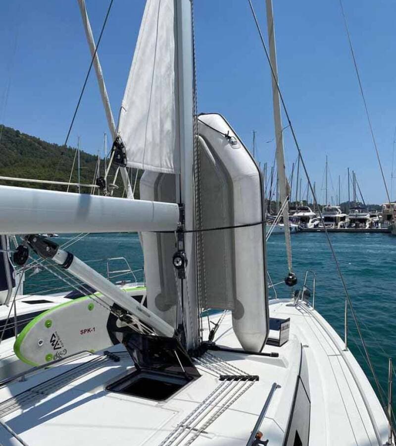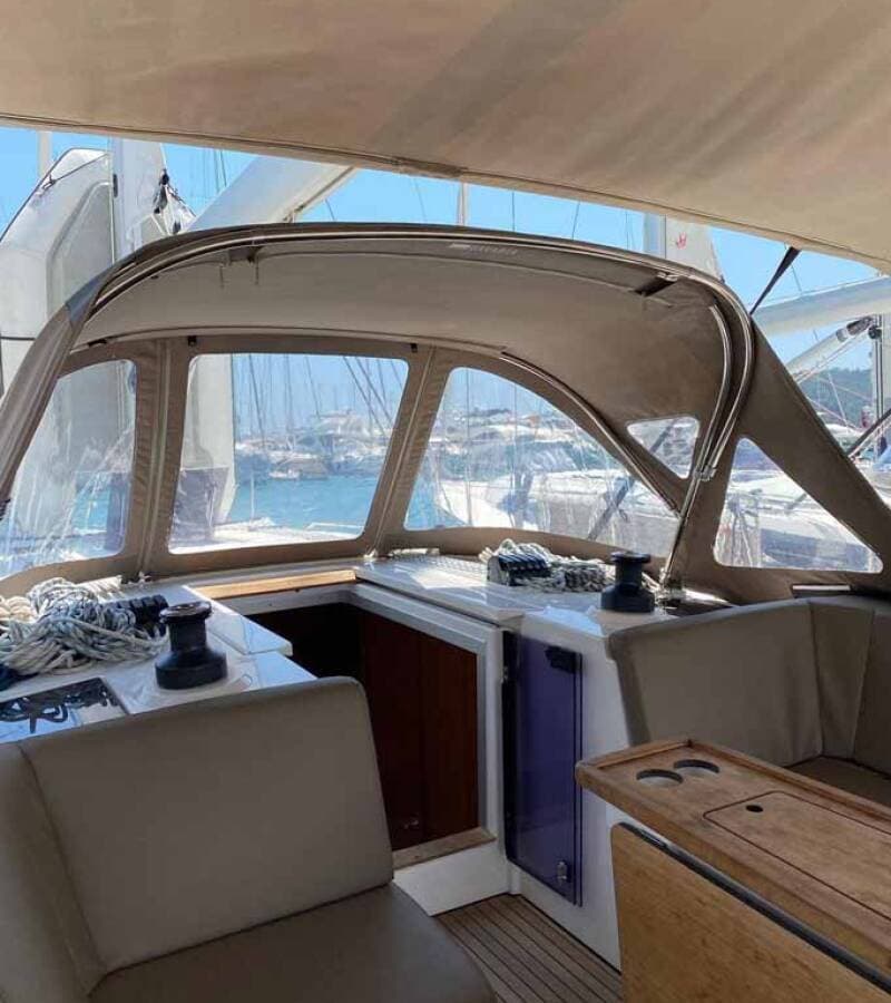- DeckAnchor lineAnchor swivelBimini topBoat hookBosun's chair (Safe seat) (boatswain's chair)Canister for waterCockpit table with lightCockpit/stern, outside showerDinghyDinghy (byboat) pumpElectric anchor windlassFendersGangwayImpeller, V-belt, oilfilterJerry cans for dieselMain anchor Mooring ropes Plastic bucketRepair box for dinghyRound/globular fenderSpare anchor (Reserve, Auxiliary anchor)Spotlight / HeadlightsSprayhoodTeak cockpitWater hose