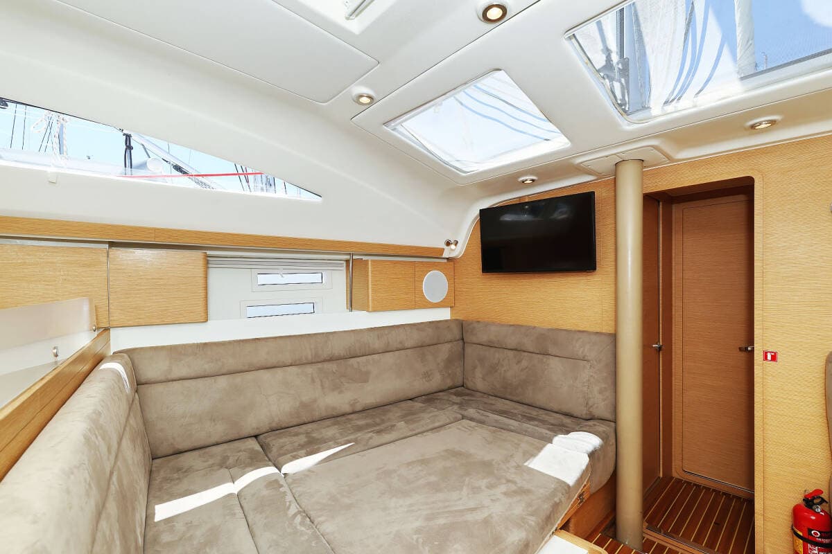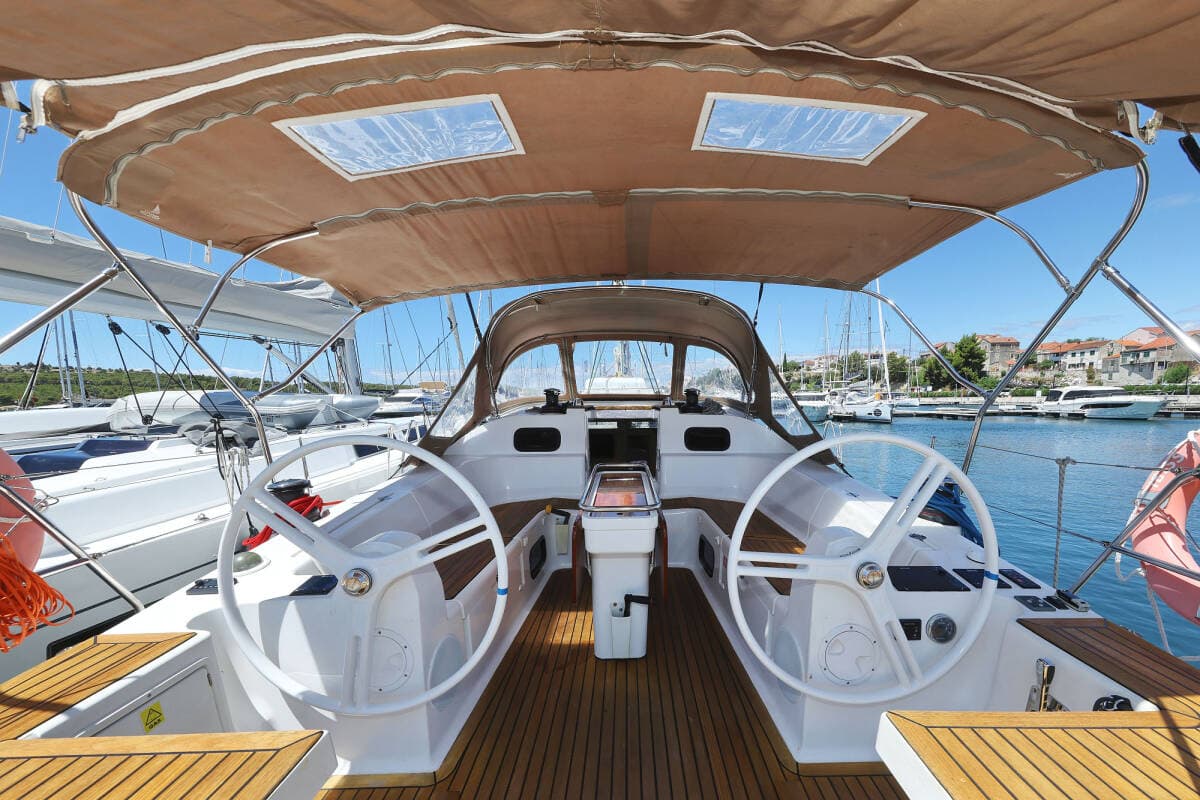 - DeckBathing platformBimini topCockpit tableCockpit/stern, outside showerDeck lightsDinghyElectric anchor windlassSprayhoodSwimming ladderTeak cockpit