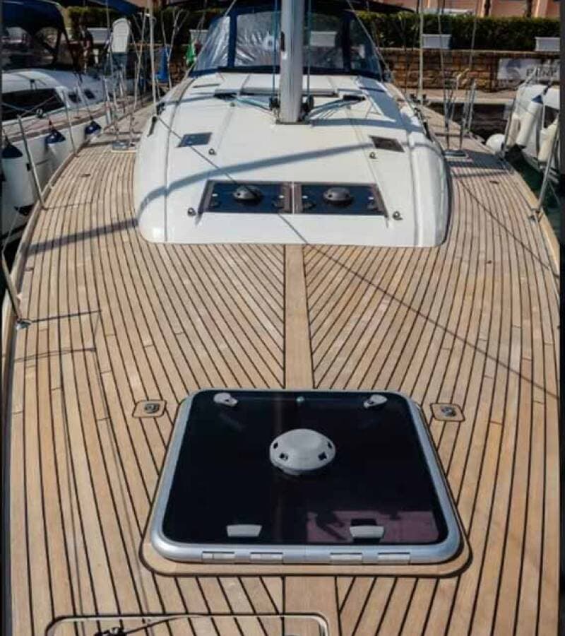 - DeckAnchor line Bimini topBlack ballBlack conusBoat hookBosun's chair (Safe seat) (boatswain's chair)Canister for waterCockpit full tentCockpit table Cockpit/stern, outside showerDinghyDinghy (byboat) pumpElectric anchor windlassFendersGangwayImpeller, V-belt, oilfilterJerry cans for dieselMain anchor Mooring ropes Plastic bucketRepair box for dinghyRound/globular fenderSpare anchor (Reserve, Auxiliary anchor)SprayhoodSpring lineTeak cockpit Teak deck Water hose