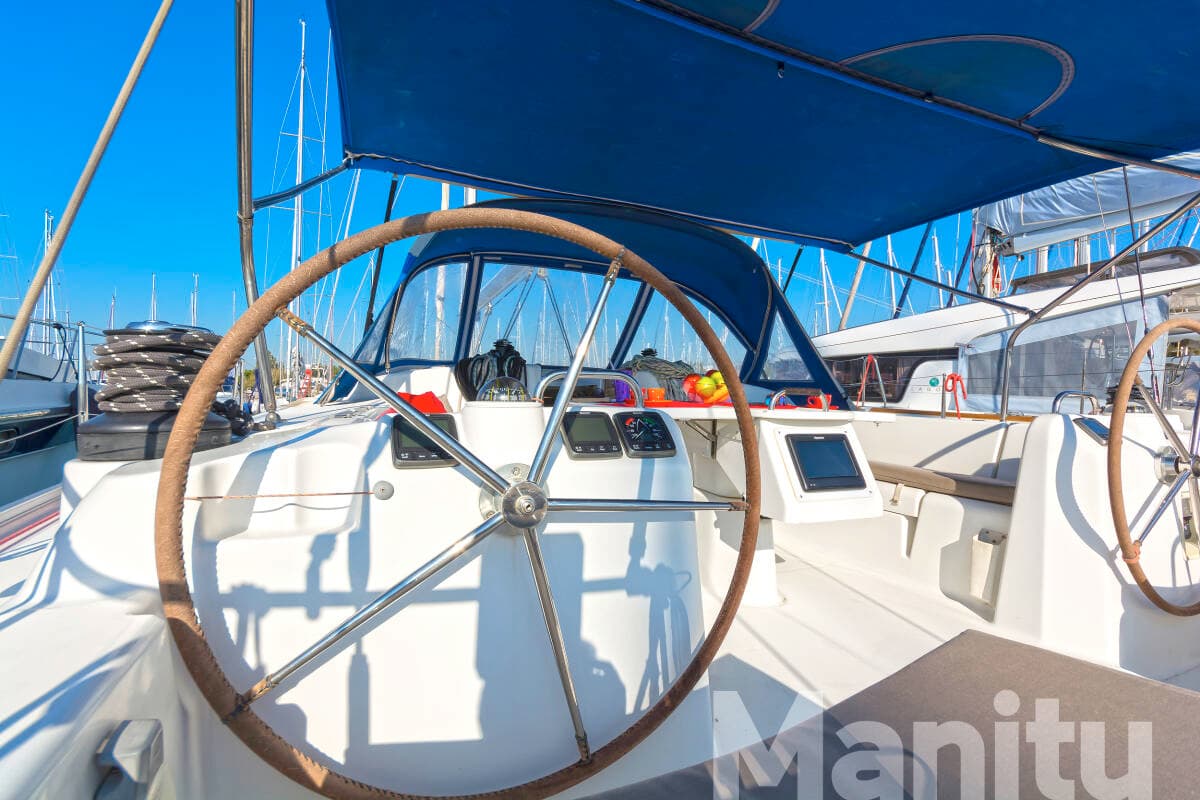 - DeckAnchorAnchor DeltaBimini topBlack ballBoat hookCockpit tableDinghyDinghy with outboard engineElectric anchor windlassFendersGangwayMain anchorOutboard engineSpare anchor (Reserve, Auxiliary anchor)SprayhoodSwimming ladderWater hoseWinch handles