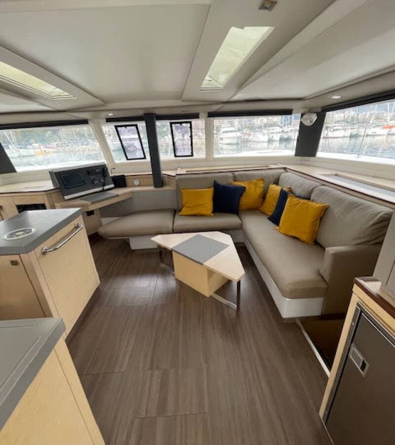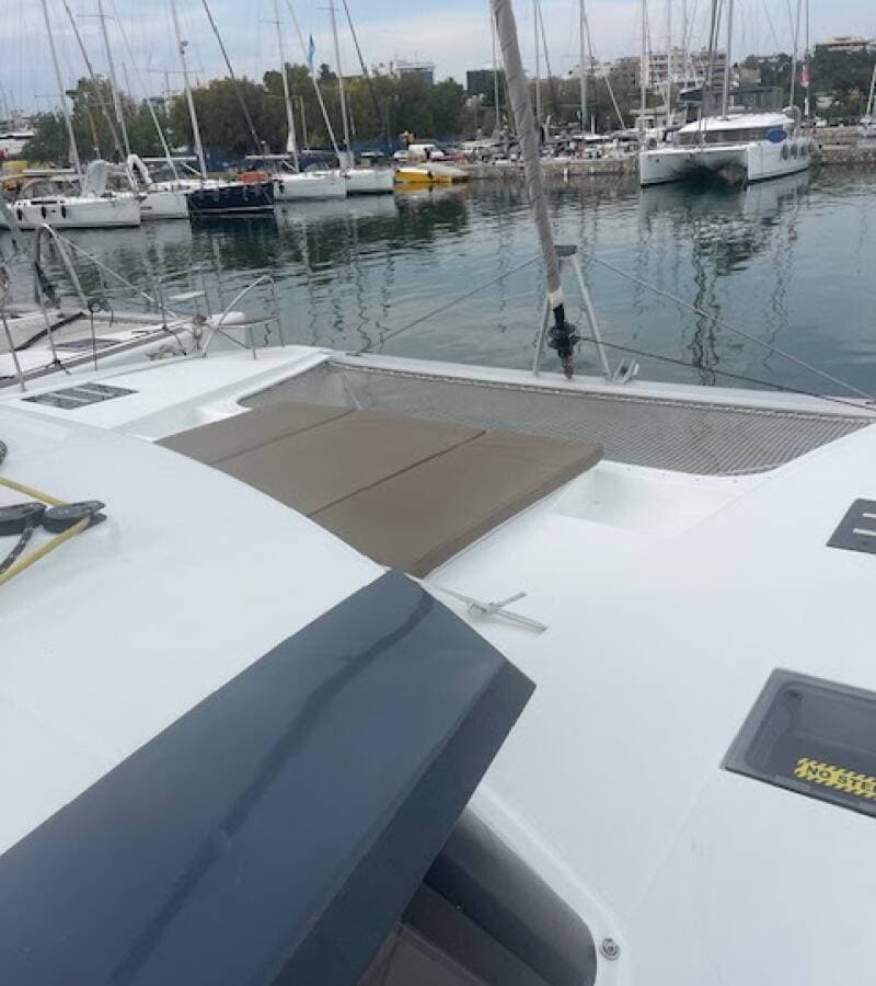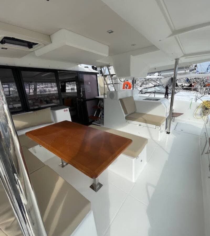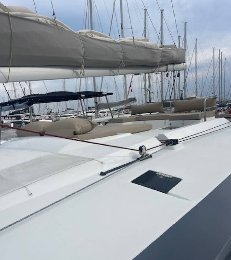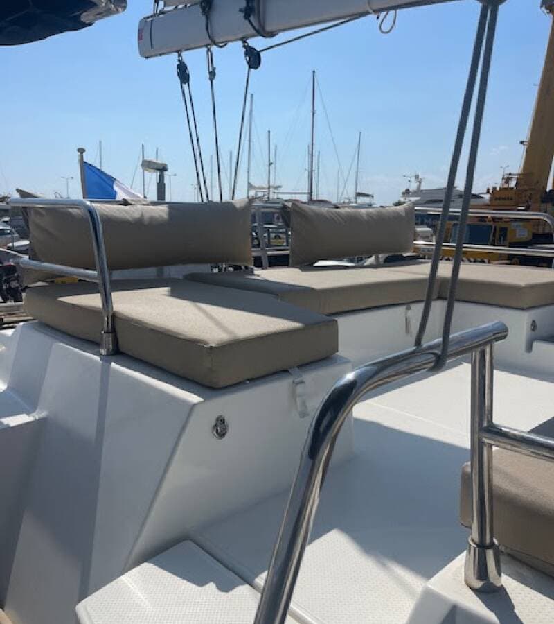 - DeckBimini topCockpit tableCockpit/stern, outside showerDinghy with outboard engineSprayhoodSwimming ladder