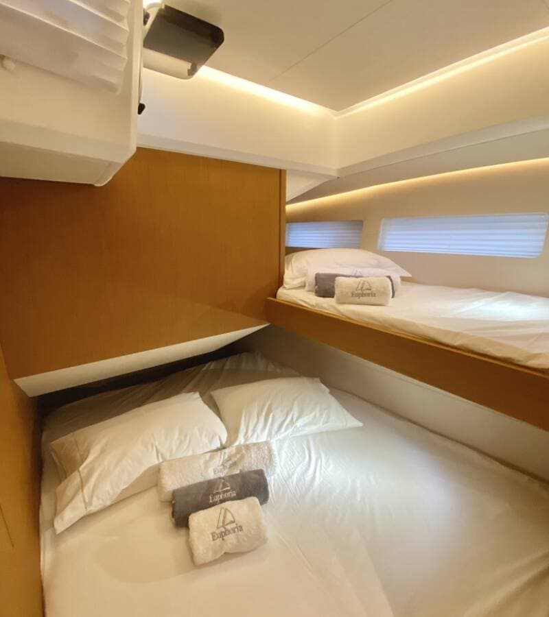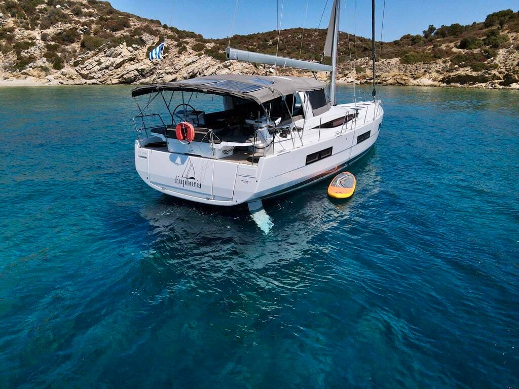 - DeckBimini topCockpit tableCockpit/stern, outside showerDinghyElectric anchor windlassHydraulic gangwayOutboard engineSprayhoodSwimming ladder