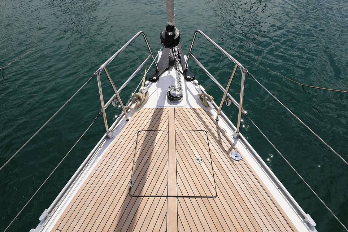 - DeckAnchor lineAnchor swivelBimini topBlack ballBlack conusBoat hookBosun's chair (Safe seat) (boatswain's chair)Canister for waterCockpit tableCockpit/stern, outside showerDinghyDinghy (byboat) pumpElectric anchor windlassFendersGangwayHawserImpeller Jerry cans for dieselMain anchor Mooring ropes Plastic bucketRepair box for dinghyRound/globular fenderSpare anchor (Reserve, Auxiliary anchor)Spotlight / HeadlightsSprayhoodSpring lineTeak cockpitTeak deckWater hose