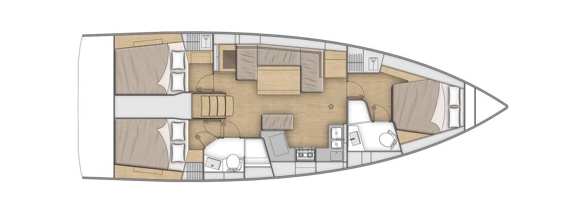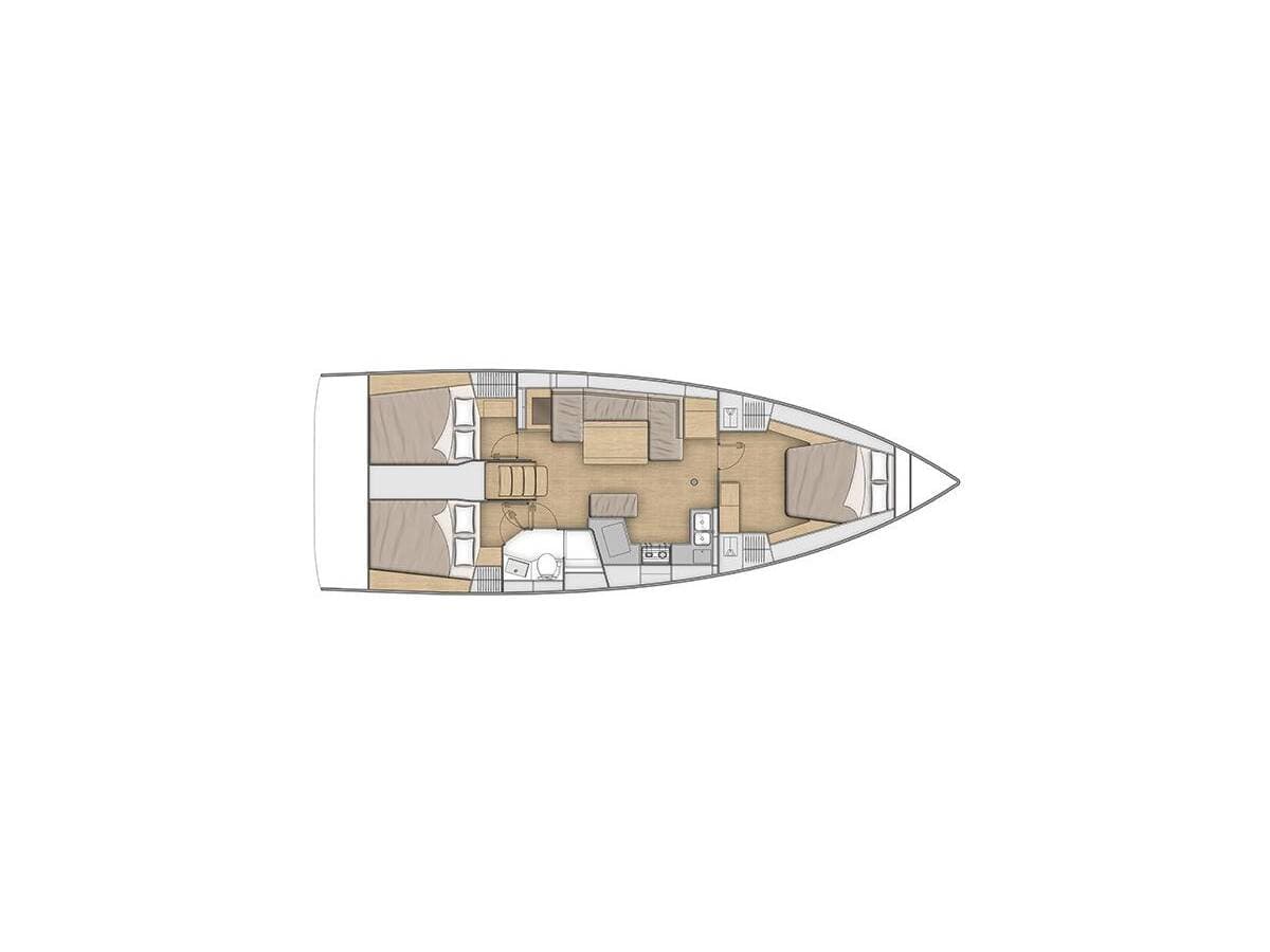 - DeckAnchorAnchor with chainBathing platformBimini topBosun's chair (Safe seat) (boatswain's chair)Cockpit/stern, outside showerDinghyDinghy with outboard engineFendersGangwayIce box in cockpitMooring ropes Spare anchor (Reserve, Auxiliary anchor)SprayhoodSwimming ladderTeak cockpit