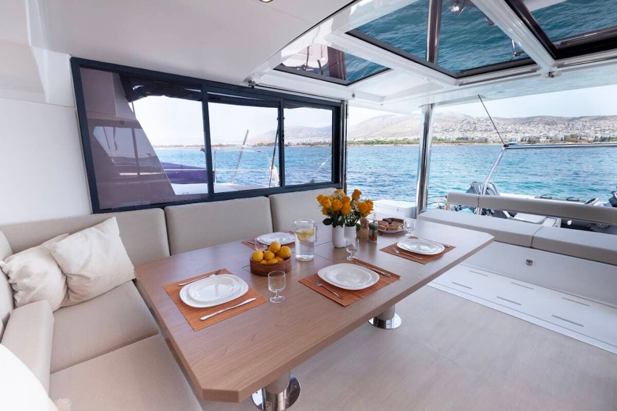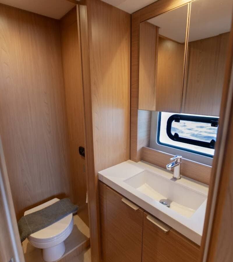 - DeckBimini topCockpit tableCockpit/stern, outside showerDavit DinghyElectric anchor windlass GangwayGrill/Barbecue/PlanchaOutboard engineSpring cleatsSwimming ladder