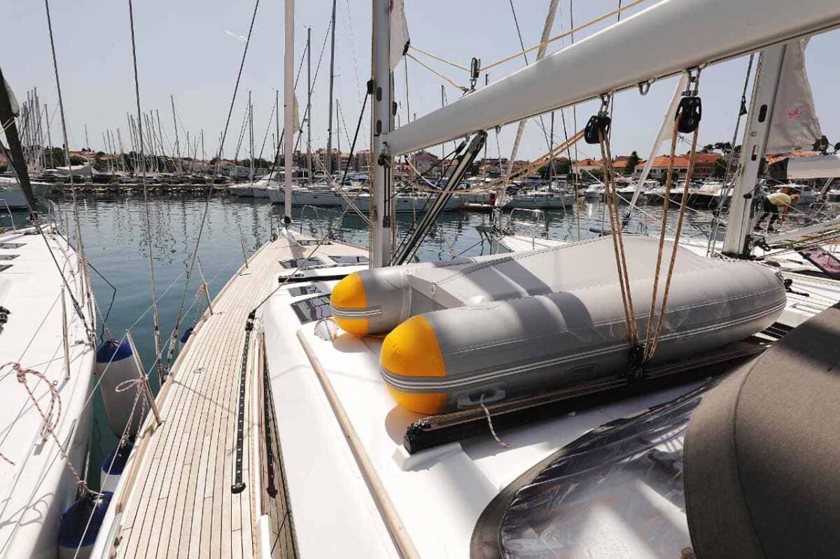 - DeckAnchor lineAnchor swivelBathing platformBimini topBlack ballBlack conusBoat hookBosun's chair (Safe seat) (boatswain's chair)Canister for waterCockpit tableCockpit/stern, outside showerDinghyDinghy (byboat) pumpElectric anchor windlassFendersGangwayHawserImpeller, V-belt, oilfilterJerry cans for dieselMain anchorMooring ropes Plastic bucketRepair box for dinghyRound/globular fenderSpare anchor (Reserve, Auxiliary anchor)Spotlight / HeadlightsSprayhoodSpring lineTeak cockpitTeak deckWater hose