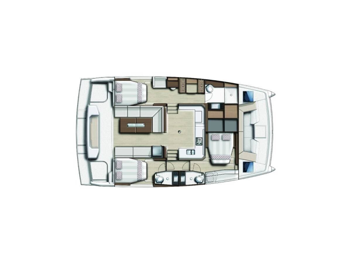 - DeckBimini topCockpit tableCockpit/stern, outside showerDinghyElectric anchor windlassOutboard engineSwimming ladder